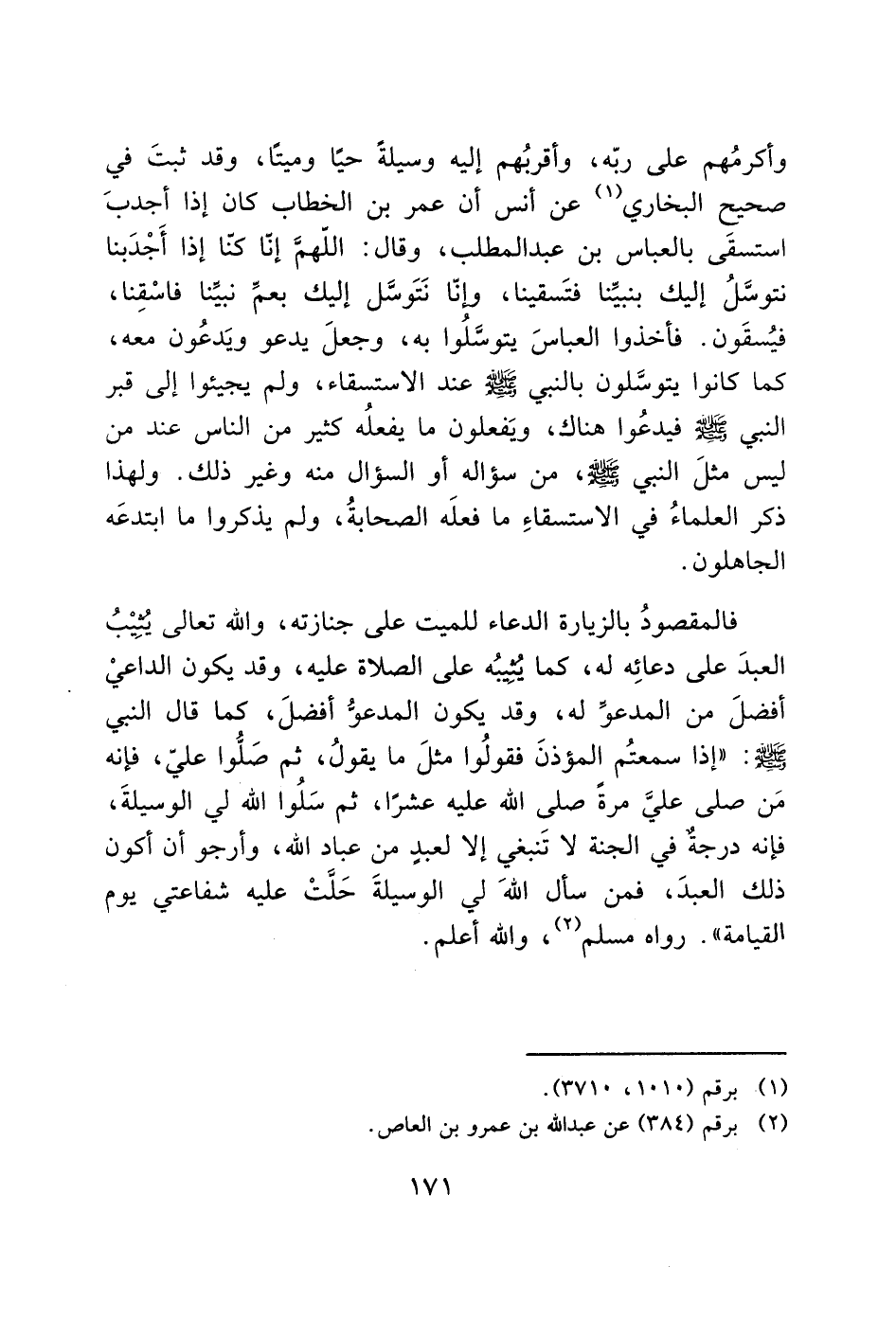 وأكرمُهم على ربّه، وأقربُهم إليه وسيلةً حيًا وميتًا، وقد ثبتَ في صحيح البخاري (1) عن أنس أن عمر بن الخطاب كان إذا أجدبَ استسقَى بالعباس بن عبد المطلب، وقال: اللهمَّ إنّا كنّا إذا أَجْدَبنا نتوسَّلُ إليك بنبيِّنا فتَسقينا، وإنّا نَتَوسَّل إليك بعمِّ نبينا فاسْقِنا، فيُسقَون. فأخذوا العباسَ يتوسَّلُوا به، وجعلَ يدعو ويَدعُون معه، كما كانوا يتوسَّلون بالنبي - صَلَّى اللَّهُ عَلَيْهِ وَسَلَّمَ - عند الاستسقاء، ولم يجيئوا إلى قبر النبي - صَلَّى اللَّهُ عَلَيْهِ وَسَلَّمَ - فيدعُوا هناك، ويَفعلون ما يفعلُه كثير من الناس عند من ليس مثلَ النبي - صَلَّى اللَّهُ عَلَيْهِ وَسَلَّمَ -، من سؤاله أو السؤال منه وغير ذلك. ولهذا ذكر العلماءُ في الاستسقاءِ ما فعلَه الصحابةُ، ولم يذكروا ما ابتدعَه الجاهلون.