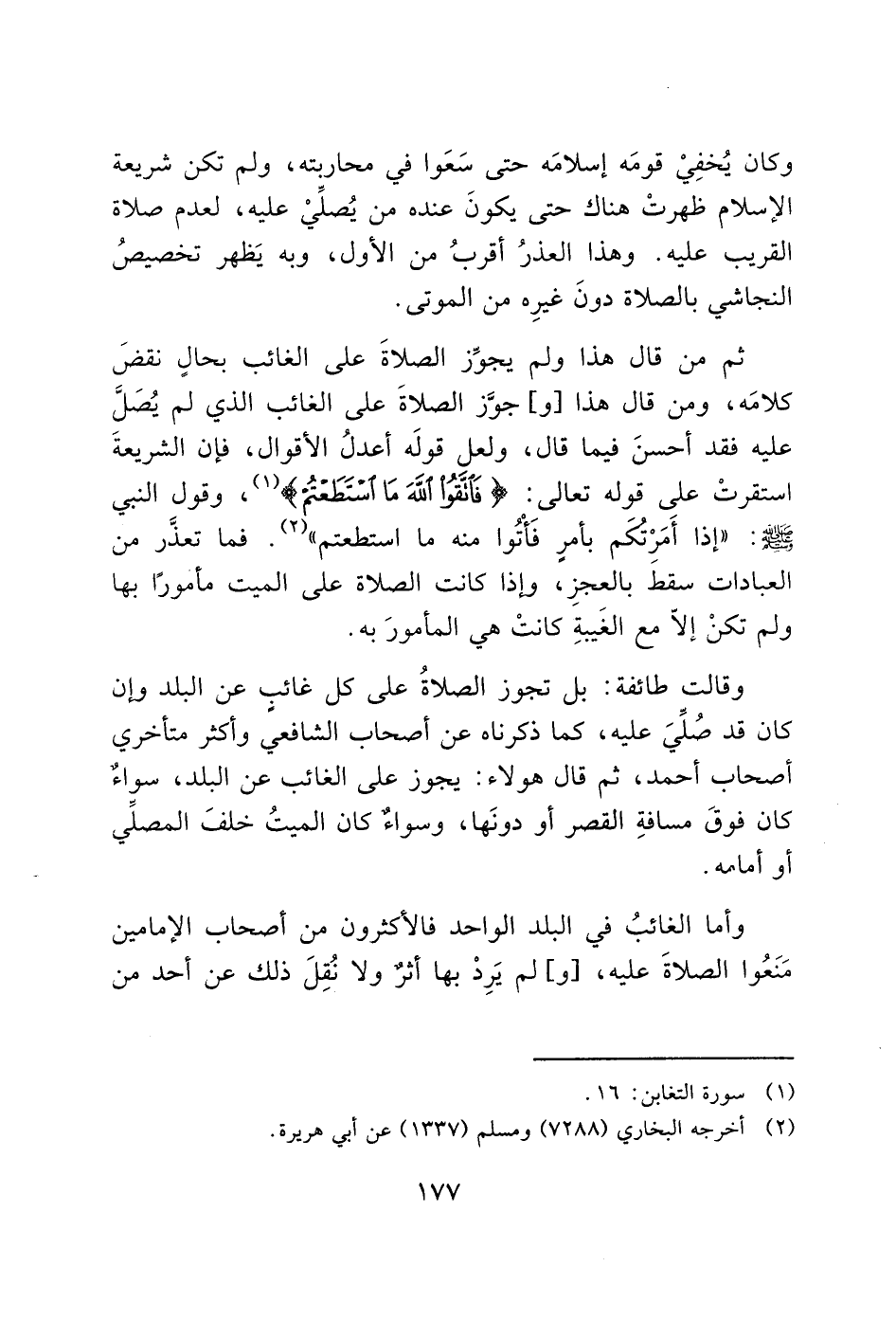 ثم من قال هذا ولم يجوِّز الصلاةَ على الغائب بحالٍ نقضَ كلامَه، ومن قال هذا [و] جوَّز الصلاةَ على الغائب الذي لم يُصل عليه فقد أحسنَ فيما قال، ولعل قولَه أعدلُ الأقوال، فإن الشريعةَ استقرتْ على قوله تعالى: (فَاتَّقُوا اللَّهَ مَا اسْتَطَعْتُمْ) (1)، وقول النبي - صَلَّى اللَّهُ عَلَيْهِ وَسَلَّمَ -: "إذا أَمَرتكَم بأمر فَأْتُوا منه ما استطعتم" (2). فما تعذَّر من العبادات سقط بالعجزِ، وإذا كانت الصلاة على الميت مأمورًا بها ولم تكنْ إلاّ مع الغَيبةِ كانتْ هي المأمورَ به.