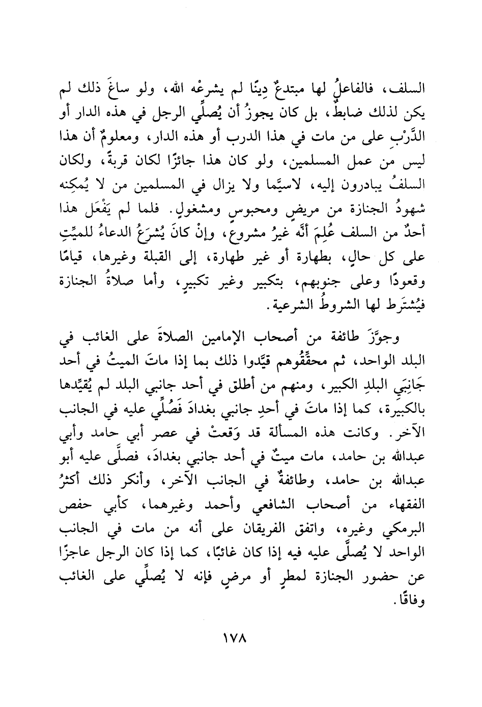 وجوَّزَ طائفة من أصحاب الإمامين الصلاةَ على الغائب في البلد الواحد، ثم محقِّقُوهم قيَّدوا ذلك بما إذا ماتَ الميتُ في أحد جَانِبَي البلدِ الكبير، ومنهم من أطلق في أحد جانبي البلد لم يُقيِّدها بالكبيَرة، كما إذا ماتَ في أحدِ جانبي بغدادَ فَصُلِّي عليه في الجانب الآخر. وكانت هذه المسألة قد وَقعتْ في عصر أبي حامد وأبي عبد الله بن حامد، مات ميت في أحد جانبي بغدادَ، فصلَّى عليه أبو عبد الله بن حامد، وطائفة في الجانب الآخر، وأنكر ذلك أكثرُ الفقهاء من أصحاب الشافعي وأحمد وغيرهما، كأبي حفص البرمكي وغيره، واتفق الفريقان على أنه من مات في الجانب الواحد لا يُصلَّى عليه فيه إذا كان غائبًا، كما إذا كان الرجل عاجزًا عن حضور الجنازة لمطرٍ أو مرضٍ فإنه لا يُصلِّي على الغائب وفاقًا.