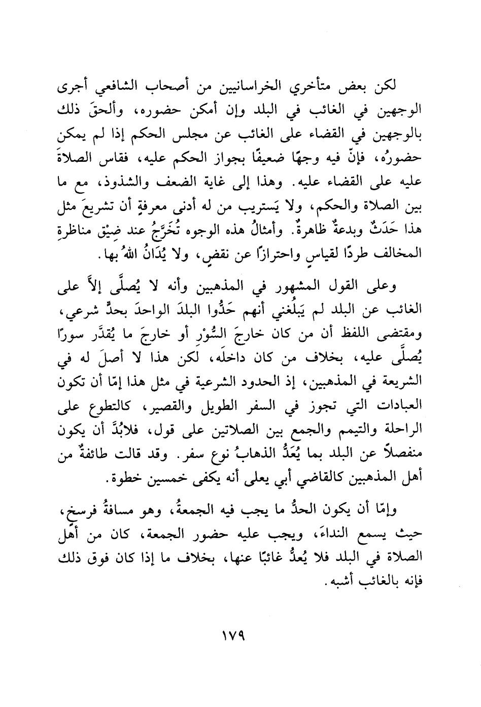 لكن بعض متأخري الخراسانيين من أصحاب الشافعي أجرى الوجهين في الغائب في البلد وإن أمكن حضوره، وألحقَ ذلك بالوجهين في القضاء على الغائب عن مجلس الحكم إذا لم يمكن حضورُه، فإنّ فيه وجهًا ضعيفًا بجواز الحكم عليه، فقاس الصلاةَ عليه على القضاء عليه. وهذا إلى غاية الضعف والشذوذ، مع ما بين الصلاة والحكم، ولا يَستريب من له أدنى معرفة أن تشريعَ مثل هذا حَدَث وبدعة ظاهرةٌ. وأمثالُ هذه الوجوه تُخَرَّجُ عند ضِيْق مناظرةِ المخالف طردًا لقياسٍ واحترازًا عن نقضٍ، ولا يُدَانُ الله بها.
