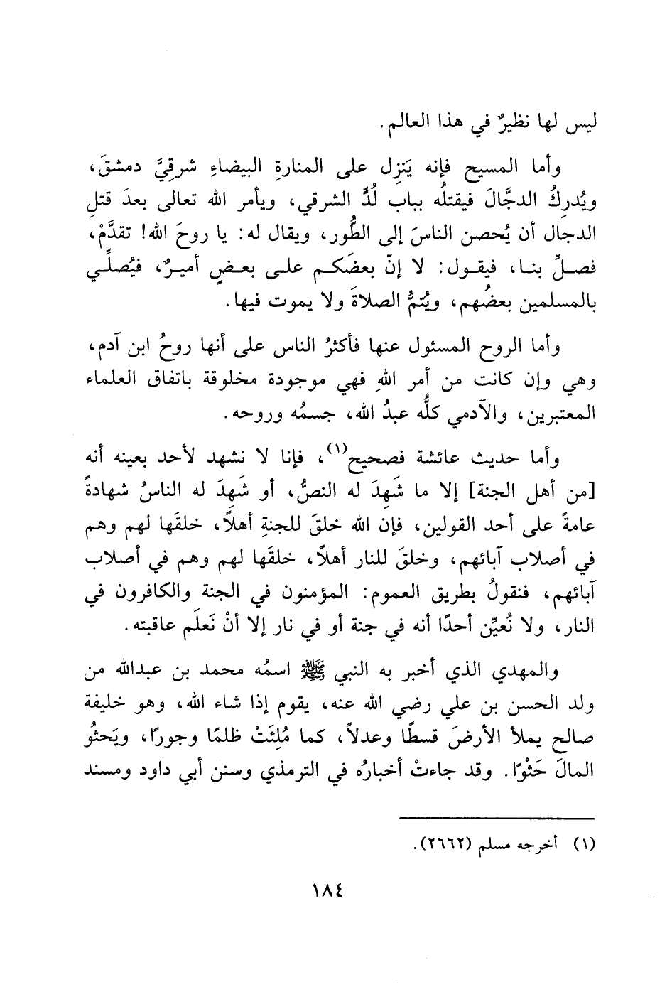 والمهدي الذي أخبر به النبي - صَلَّى اللَّهُ عَلَيْهِ وَسَلَّمَ - اسمُه محمد بن عبد الله من ولد الحسن بن علي رضي الله عنه، يقوم إذا شاء الله، وهو خليفة صالح يملأ الأرضَ قسطًا وعدلاً، كما مُلِئَتْ ظلمًا وجورًا، ويَحثُو المالَ حَثْوًا. وقد جاءتْ أخبارُه في الترمذي وسنن أبي داود ومسند