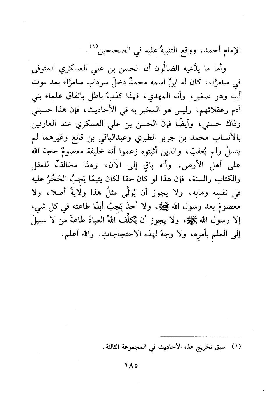 وأما ما يدَّعيه الضالُّون أن الحسن بن علي العسكري المتوفى في سامرَّاء، كان له ابنٌ اسمه محمدٌ دخلَ سرداب سامرَّاء بعد موت أبيه وهو صغير، وأنه المهدي، فهذا كذبٌ باطل باتفاق علماء بني آدم وعقلائهم، وليس هو المخبر به في الأحاديث، فإن هذا حسيني وذاك حسني، وأيضًا فإن الحسن بن علي العسكري عند العارفين بالأنساب محمد بن جرير الطبري وعبد الباقي بن قانع وغيرهما لم ينسلْ ولم يُعقبْ، والذين أثبتوه زعموا أنه خليفة معصوم حجة الله على أهل الأرض، وأنه باقٍ إلى الآن، وهذا مخالفٌ للعقل والكتاب والسنة، فإن هذا لو كان حقا لكان يتيمًا يَجبُ الحَجْرُ عليه في نفسِه ومالِه، ولا يجوز أن يُوَلَى مثلُ هذا ولَايةً أصلا، ولا معصومَ بعد رسول الله - صَلَّى اللَّهُ عَلَيْهِ وَسَلَّمَ -، ولا أحدَ يَجبُ أبدًا طاعته في كل شيء إلاّ رسول الله - صَلَّى اللَّهُ عَلَيْهِ وَسَلَّمَ -، ولا يجوز أن يُكلِّفَ الله العبادَ طاعةَ من لا سبيلَ إلى العلمِ بأمرِه، ولا وجهَ لهذه الاحتجاجاتِ. والله أعلم.