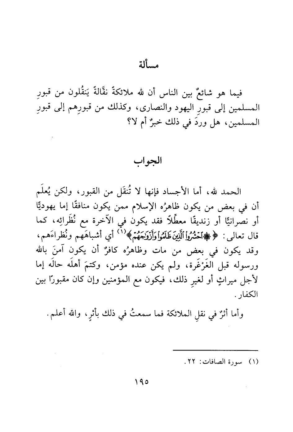 الحمد لله، أما الأجساد فإنها لا تُنقَل من القبور، ولكن يُعلَم أن في بعض من يكون ظاهرُه الإسلام ممن يكون منافقًا إما يهوديًّا أو نصرانيا أو زنديقا معطِّلاً فقد يكون في الآخرة مع نُظَرائِه، كما قال تعالى: (احْشُرُوا الَّذِينَ ظَلَمُوا وَأَزْوَاجَهُمْ) (1) أي أشباهَهم ونُظراءَهم، وقد يكون في بعض من مات وظاهرُه كافرٌ أن يكون آمنَ بالله ورسوله قبل الغَرْغَرة، ولم يكن عنده مؤمن، وكتمَ أهلَه حالَه إما لأجل ميراثٍ أو لغيرِ ذلك، فيكون مع المؤمنين وإن كان مقبورًا بين الكفار.