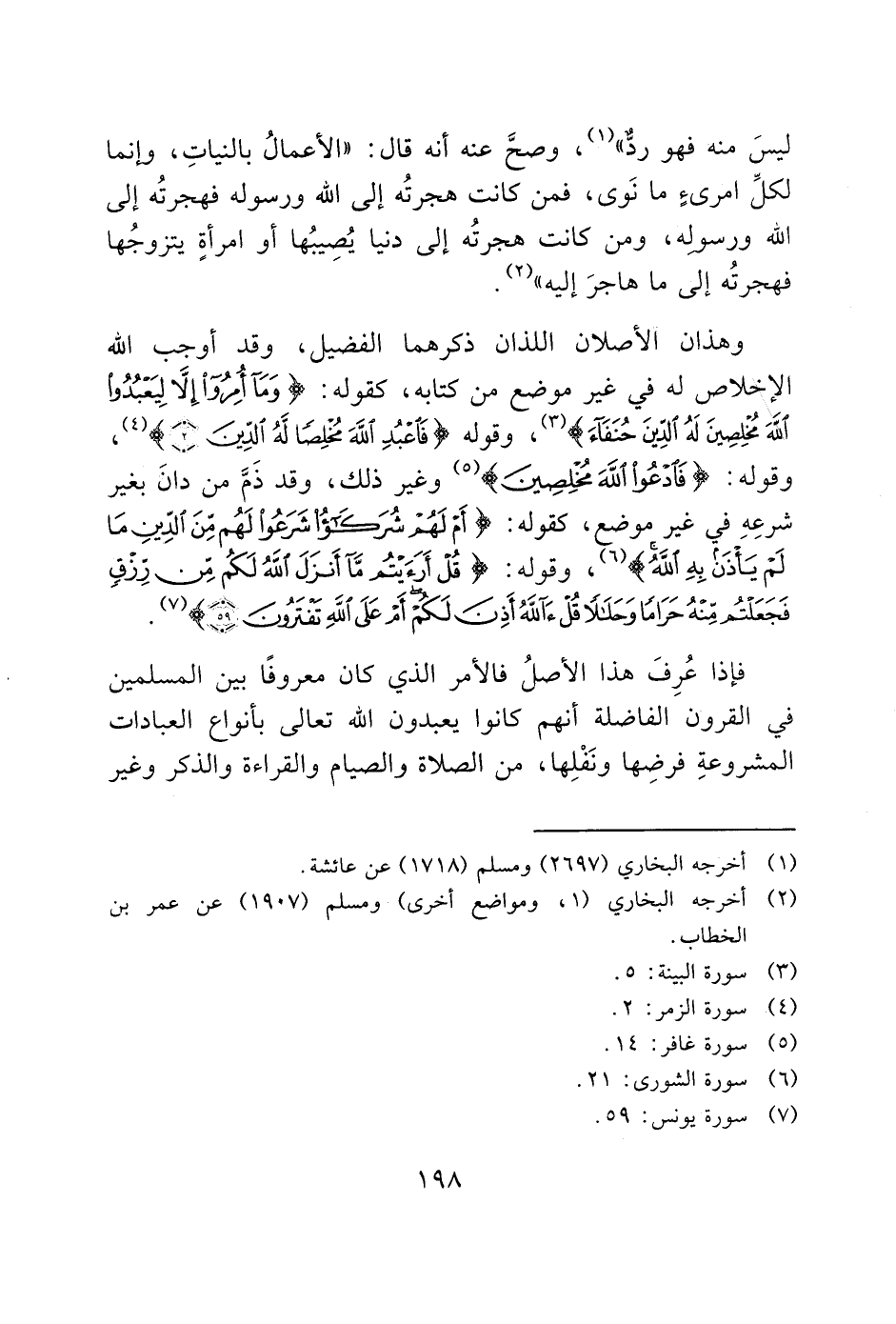 وهذان الأصلان اللذان ذكرهما الفضيل، وقد أوجب الله الإخلاص له في غير موضع من كتابه، كقوله: (وَمَا أُمِرُوا إِلَّا لِيَعْبُدُوا اللَّهَ مُخْلِصِينَ لَهُ الدِّينَ حُنَفَاءَ) (3)، وقوله (فَاعْبُدِ اللَّهَ مُخْلِصاً لَهُ الدِّينَ (2)) (4)، وقوله: (فَادْعُوا اللَّهَ مُخْلِصِينَ) (5) وغير ذلك، وقد ذَمَّ من دانَ بغير شرعِهِ في غير موضع، كقوله: (أَمْ لَهُمْ شُرَكَاءُ شَرَعُوا لَهُمْ مِنَ الدِّينِ مَا لَمْ يَأْذَنْ بِهِ اللَّهُ) (6)، وقوله: (قُلْ أَرَأَيْتُمْ مَا أَنْزَلَ اللَّهُ لَكُمْ مِنْ رِزْقٍ فَجَعَلْتُمْ مِنْهُ حَرَاماً وَحَلالاً قُلْ آللَّهُ أَذِنَ لَكُمْ أَمْ عَلَى اللَّهِ تَفْتَرُونَ (59)) (7).