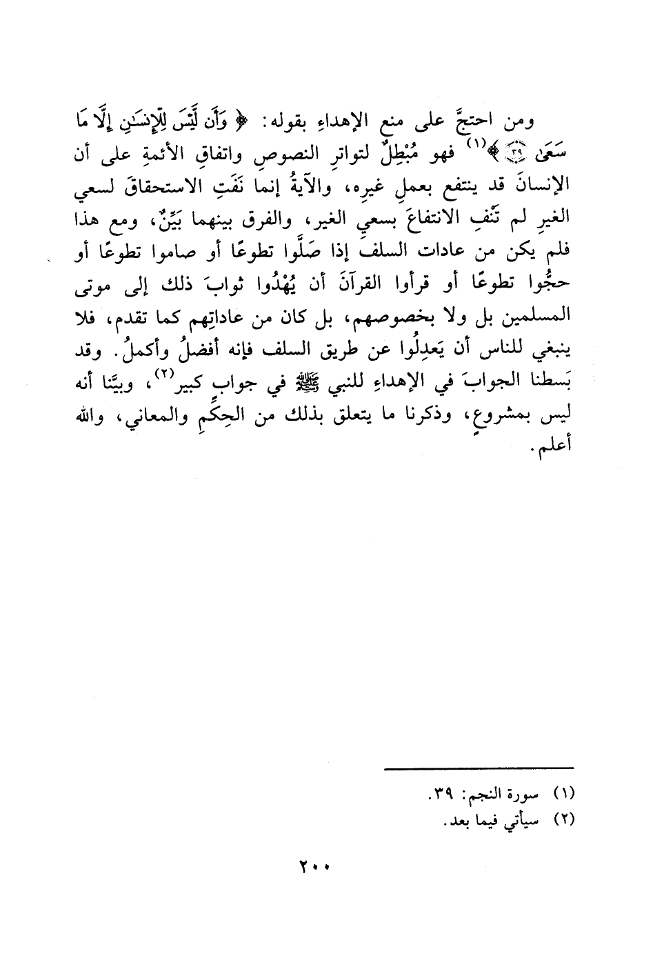 ومن احتجَّ على منع الإهداءِ بقوله: (وَأَنْ لَيْسَ لِلْإِنْسَانِ إِلَّا مَا سَعَى (39)) (1) فهو مُبْطِلٌ لتواترِ النصوصِ واتفاقِ الأئمةِ على أن الإنسانَ قد ينتفع بعملِ غيرِه، والآيةُ إنما نَفَتِ الاستحقاقَ لسعي الغيرِ لم تنفِ الانتفاعَ بسعي الغير، والفرق بينهما بَيِّنٌ، ومع هذا فلم يكن من عادات السلفَ إذا صَلَّوا تطوعًا أو صاموا تطوعًا أو حجوا تطوعًا أو قرأوا القرآنَ أن يُهْدُوا ثوابَ ذلك إلى موتى المسلمين بل ولا بخصوصهم، بل كان من عاداتِهم كما تقدم، فلا ينبغي للناس أن يَعدِلُوا عن طريق السلف فإنه أفضلُ وأكملُ. وقد بَسطنا الجوابَ في الإهداءِ للنبي - صَلَّى اللَّهُ عَلَيْهِ وَسَلَّمَ - في جواب كبير (2)، وبيَّنا أنه ليس بمشروع، وذكرنا ما يتعلق بذلك من الحِكًمِ والمعاني، والله أعلم.
