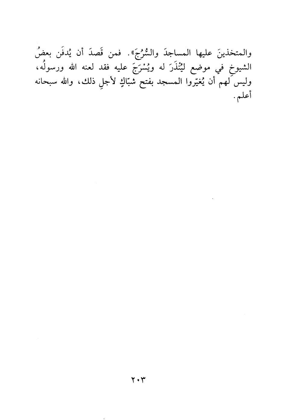 والمتخذينَ عليها المساجدَ والسُّرُجَ". فمن قَصدَ أن يُدفَن بعضُ الشيوخِ في موضع ليُنْذَرَ له ويُسْرَجَ عليه فقد لعنه الله ورسولُه، وليس لهم أن يُغيّروا المسجد بفتح شبّاكٍ لأجلِ ذلك، والله سبحانه أعلم.