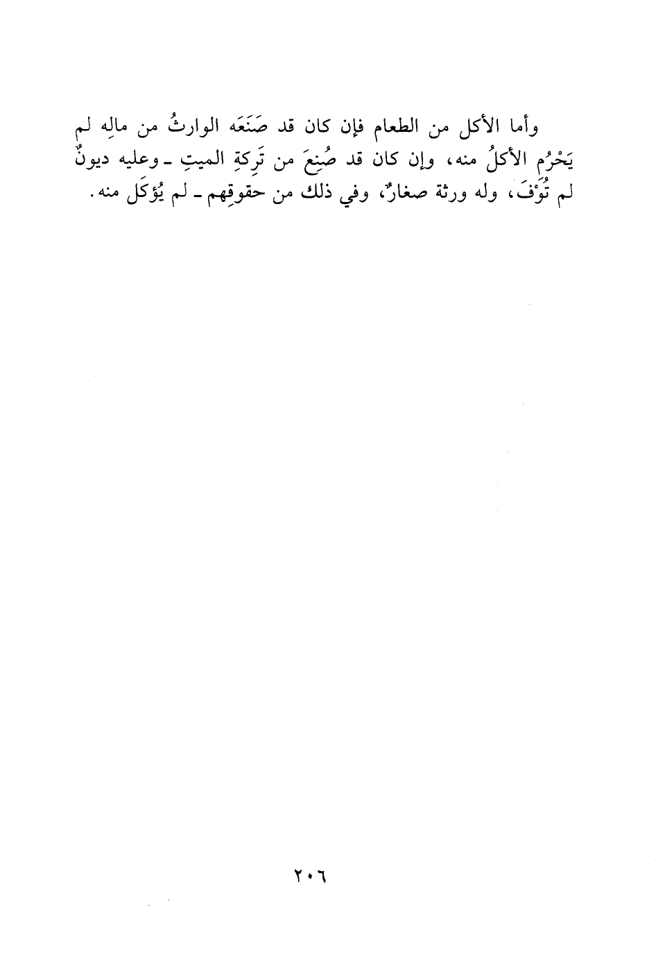 وأما الأكل من الطعام فإن كان قد صَنَعَه الوارثُ من مالِه لم يَحْرُم الأكلُ منه، وإن كان قد صُنِعَ من تَرِكةِ الميتِ - وعليه ديون لم تُوْفَ، وله ورثة صغار، وفي ذلك من حقوقِهم - لم يُؤكَل منه.