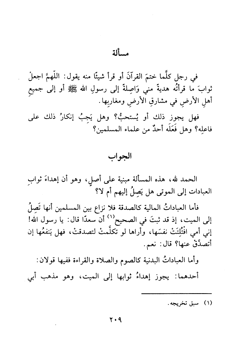 في رجل كلَّما ختمَ القرآنَ أو قرأ شيئًا منه يقول: اللهمَّ اجعلْ ثوابَ ما قرأتُه هديةً مني وَاصِلةً إلى رسولِ الله - صَلَّى اللَّهُ عَلَيْهِ وَسَلَّمَ - أو إلى جميعِ أهلِ الأرضِ في مشارقِ الأرضِ ومغاربِها.