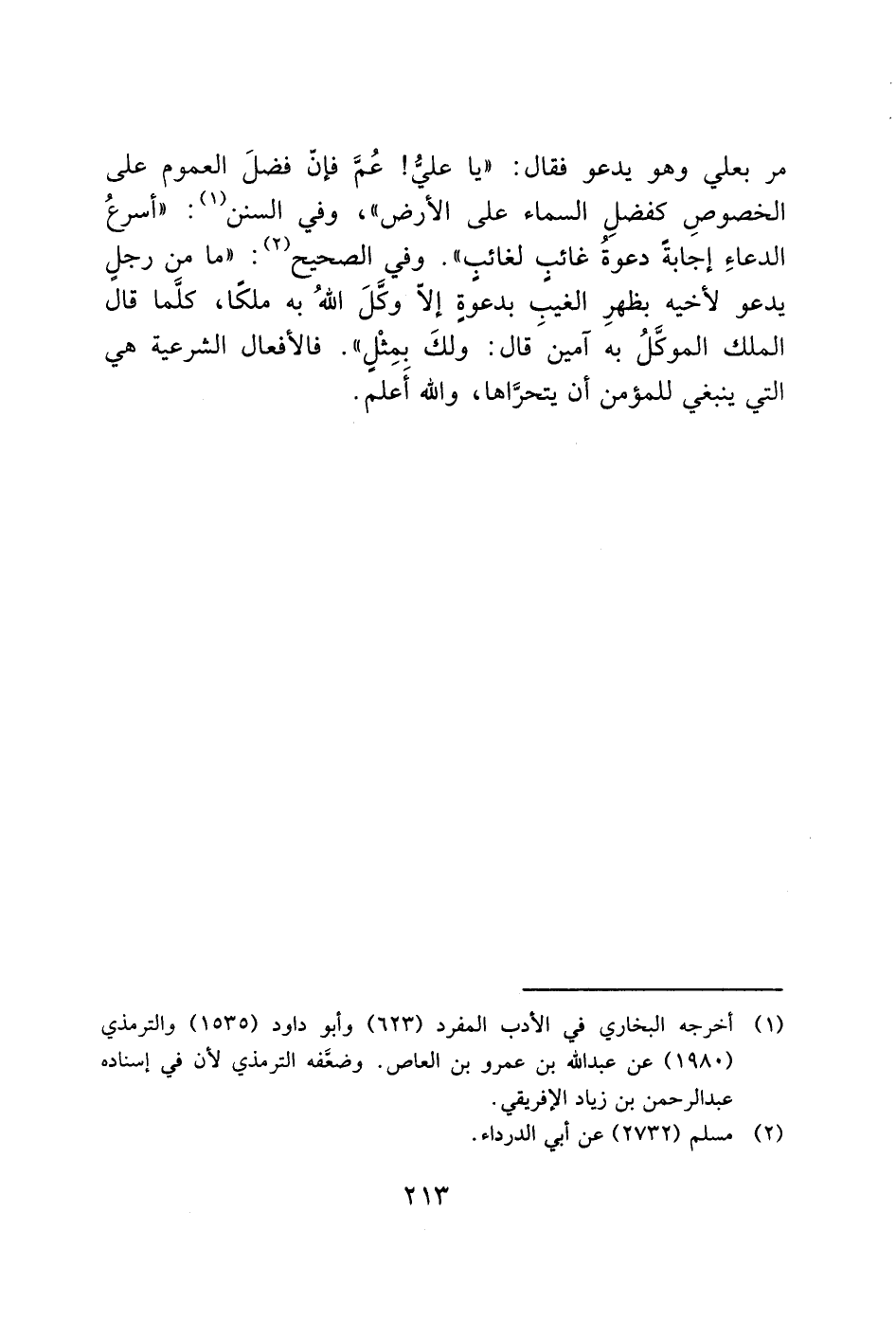 مر بعلي وهو يدعو فقال: "يا عليُّ! عُمَّ فإن فضلَ العموم على الخصوصِ كفضلِ السماء على الأرض"، وفي السنن (1): "أسرعُ الدعاءِ إجابةً دعوةُ غائب لغائبٍ". وفي الصحيح (2): "ما من رجلٍ يدعو لأخيه بظهرِ الغيب بدعوةٍ إلاّ وكَّلَ اللهُ به ملكًا، كلَّما قال الملك الموكَّلُ به آمينَ قال: ولكَ بمِثْل". فالأفعال الشرعية هي التي ينبغي للمؤمن أن يتحرَّاها، والله أَعلم.