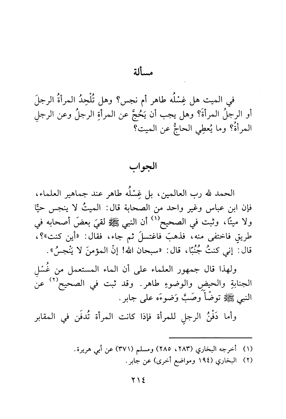 في الميت هل غِسْلُه طاهر أم نجس؟ وهل تُلْحِدُ المرأةُ الرجل أو الرجلُ المرأةَ؟ وهل يجب أن يَحُجَّ عن المرأةِ الرجلُ وعن الرجلِ المرأةُ؟ وما يُعطِي الحاجُّ عن الميت؟