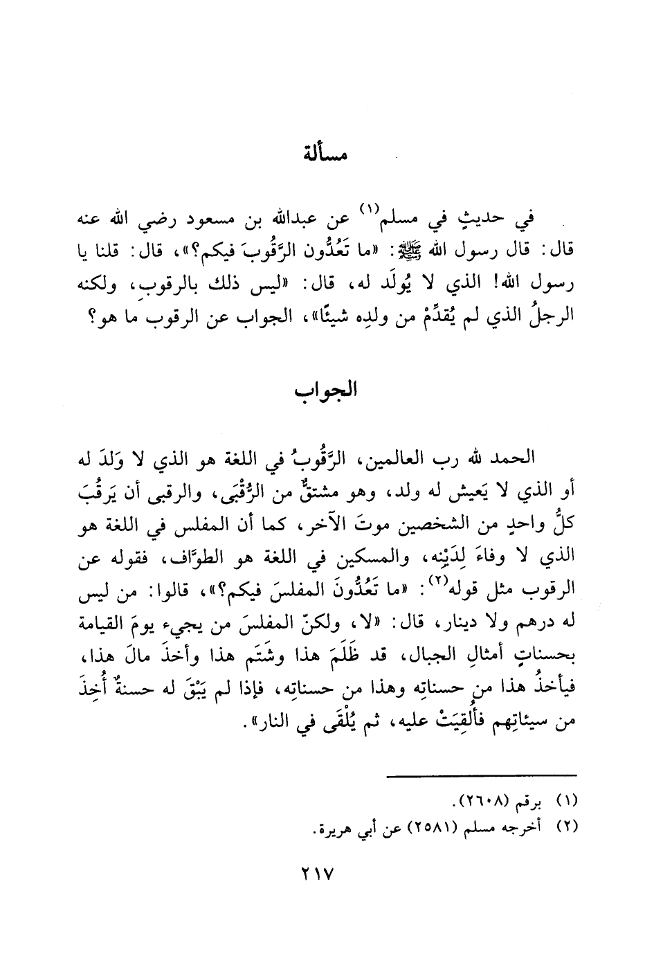 الحمد لله رب العالمين، الرَّقُوبُ في اللغة هو الذي لا وَلدَ له أو الذي لا يَعيش له ولد، وهو مشتق من الرُّقْبَى، والرقبى أن يَرقُبَ كل واحدٍ من الشخصين موتَ الآخر، كما أن المفلس في اللغة هو الذي لا وفاءَ لِدَينه، والمسكين في اللغة هو الطوَّاف، فقوله عن الرقوب مثل قوله (2): "ما تَعُدُّونَ المفلسَ فيكم؟ "، قالوا: من ليس له درهم ولا دينار، قال: "لا، ولكن المفلسَ من يجيء يومَ القيامة بحسناتٍ أمثالِ الجبال، قد ظَلَمَ هذا وشَتَم هذا وأخذَ مالَ هذا، فيأخذُ هذا من حسناتِه وهذا من حسناتِه، فإذا لم يَبْقَ له حسنةٌ أُخِذَ من سيئاتِهم فألُقِيَتْ عليه، ثم يُلْقَى في النار".