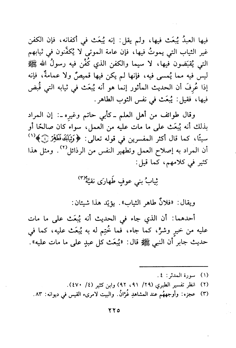 وقال طوائف من أهل العلم - كأبي حاتم وغيرِه -: إن المراد بذلك أنه يُبعث على ما مات عليه من العمل، سواء كان صالحًا أو سيئًا، كما قال أكثر المفسرين في قوله تعالى: (وَثِيَابَكَ فَطَهِّرْ (4)) (1) أن المراد به إصلاح العمل وتطهير النفس من الرذائل (2). ومثل هذا كثير في كلامهم، كما قيل:
