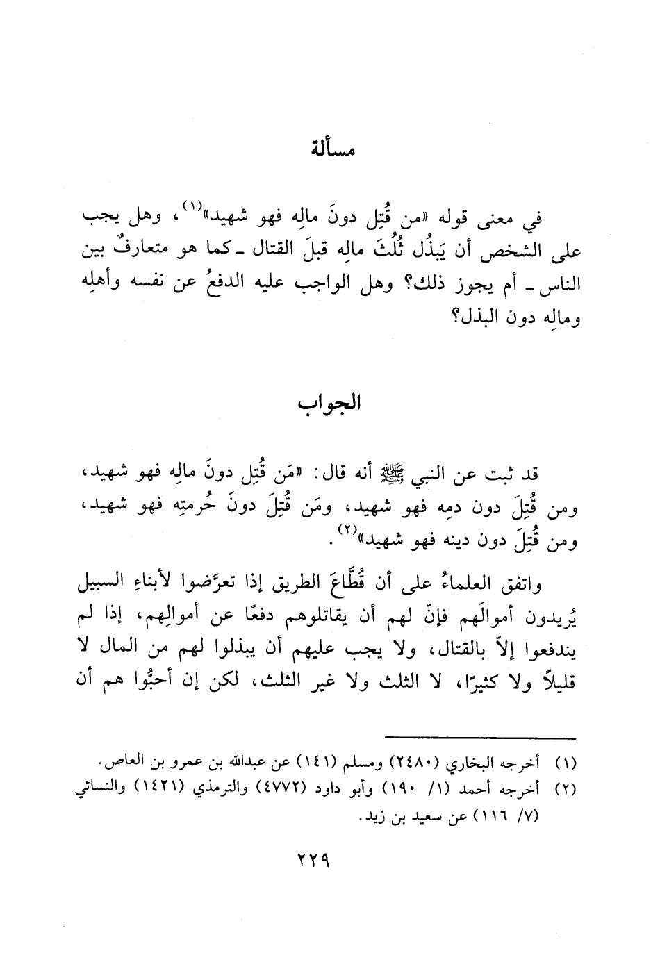 في معنى قوله "من قُتِل دونَ مالِه فهو شهيد" (1)، وهل يجب على الشخص أن يَبذُل ثُلُثَ مالِه قبلَ القتال - كما هو متعارفٌ بين الناس - أم يجوز ذلك؟ وهل الواجب عليه الدفعُ عن نفسه وأهلِه ومالِه دون البذل؟
