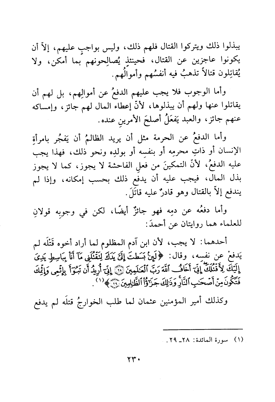 أحدهما: لا يجب، لأن ابن آدم المظلوم لما أراد أخوه قَتْلَه لم يَدفعْ عن نفسِه، وقال: (لَئِنْ بَسَطْتَ إِلَيَّ يَدَكَ لِتَقْتُلَنِي مَا أَنَا بِبَاسِطٍ يَدِيَ إِلَيْكَ لِأَقْتُلَكَ إِنِّي أَخَافُ اللَّهَ رَبَّ الْعَالَمِينَ (28) إِنِّي أُرِيدُ أَنْ تَبُوءَ بإِثْمِي وَإِثْمِكَ فَتَكُونَ مِنْ أَصْحَابِ النَّارِ وَذَلِكَ جَزَاءُ الظَّالِمِينَ (29)) (1).