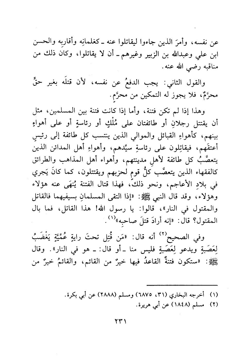 وهذا إذا لم تكن فتنة، وأما إذا كانت فتنة بين المسلمين، مثل أن يقتتل رجلانِ أو طائفتان على مُلْكِ أو رئاسةِ أو على أهواء بينهم، كأهواءِ القبائل والموالي الذين ينتسب كل طائفة إلى رئيسٍ أعتقَهم، فيقاتِلون على رئاسةِ سيدهم، وأهواءِ أهل المدائن الذين يتعصَّبُ كل طائفة لأهلِ مدينتهم، وأهواء أهل المذاهب والطرائق كالفقهاء الذين يتعصَّب كل قومِ لحزبهم ويقتتلون، كما كانَ يَجري في بلادِ الأعاجم، ونحو ذلك، فهذا قتال الفتنة يُنهَى عنه هؤلاء وهؤلاء، وقد قال النبي - صَلَّى اللَّهُ عَلَيْهِ وَسَلَّمَ -: "إذا التقى المسلمانِ بسيفيهما فالقاتل والمقتول في النار"، قالوا: يا رسول الله! هذا القاتل، فما بال المقتول؟ قال: "إنه أرادَ قتلَ صاحبِه" (1).