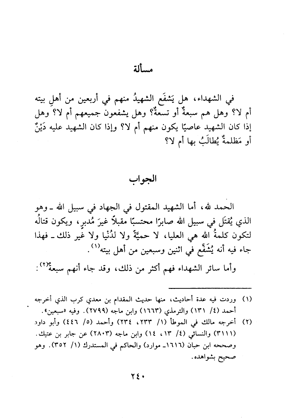 في الشهداء، هل يَشفَع الشهيدُ منهم في أربعين من أهلِ بيته أم لا؟ وهل هم سبعةٌ أو تسعة؟ وهل يشفعون جميعهم أم لا؟ وهل إذا كان الشهيد عاصيًا يكون منهم أم لا؟ وإذا كان الشهيد عليه دَيْن أو مَظلمةٌ يُطالَبُ بها أم لا؟