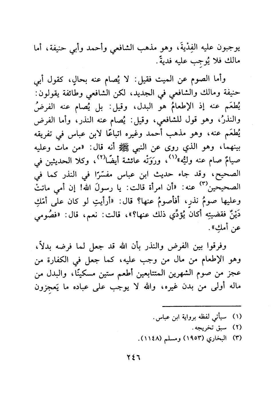 يوجبون عليه الفِدْيةَ، وهو مذهب الشافعي وأحمد وأبي حنيفة، أما مالك فلا يُوجِب عليه فديةً. وأما الصوم عن الميت فقيل: لا يُصام عنه بحالٍ، كقول أبي حنيفة ومالك والشافعي في الجديد، لكن الشافعي وطائفة يقولون: يُطعَم عنه إذ الإطعامُ هو البدل، وقيل: بل يُصام عنه الفرضُ والنذرُ، وهو قول للشافعي، وقيل: يُصام عنه النذر، وأما الفرض يُطعَم عنه، وهو مذهب أحمد وغيره اتباعًا لابن عباس في تفريقه بينهما، وهو الذي روى عن النبي - صَلَّى اللَّهُ عَلَيْهِ وَسَلَّمَ - أنه قال: "من مات وعليه صيامٌ صام عنه وليّه" (1)، ورَوَتْه عائشة أيضًا (2)، وكلا الحديثين في الصحيح، وقد جاء حديث ابن عباس مفسّرًا في النذر كما في الصحيحين (3) عنه: "أن امرأة قالت: يا رسولَ الله! إن أمي ماتتْ وعليها صومُ نذرِ، أفأصومُ عنها؟ قال: "أرأيتِ لو كان على أمّكِ دَيْنٌ فقضيتِه أكان يُؤدِّي ذلك عنها؟ "، قالت: نعم، قال: "فصُومي عن أمكِ".