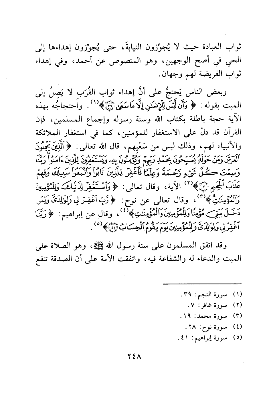 وبعض الناس يَحتجُّ على أنَّ إهداء ثواب القُرَب لا يَصِلُ إلى الميت بقوله: (وَأَنْ لَيْسَ لِلْإِنْسَانِ إِلَّا مَا سَعَى (39)) (1). واَحتجاجُه بهذه الآية حجة باطلة بكتاب الله وسنة رسوله وإجماع المسلمين، فإن القرآن قد دلّ على الاستغفار للمؤمنين، كما في استغفار الملائكة والأنبياء لهم، وذلك ليس من سَعْيِهم، قال الله تعالى: (الَّذِينَ يَحْمِلُونَ الْعَرْشَ وَمَنْ حَوْلَهُ يُسَبِّحُونَ بِحَمْدِ رَبِّهِمْ وَيُؤْمِنُونَ بِهِ وَيَسْتَغْفِرُونَ لِلَّذِينَ آمَنُوا رَبَّنَا وَسِعْتَ كُلَّ شَيْءٍ رَحْمَةً وَعِلْماً فَاغْفِرْ لِلَّذِينَ تَابُوا وَاتَّبَعُوا سَبِيلَكَ وَقِهِمْ عَذَابَ الْجَحِيمِ (7)) (2) الآية، وقال تعالى: (وَاسْتَغْفِرْ لِذَنْبِكَ وَلِلْمُؤْمِنِينَ وَالْمُؤْمِنَاتِ) (3)، وقال تعالى عن نوح: (رَبِّ اغْفِرْ لِي وَلِوَالِدَيَّ وَلِمَنْ دَخَلَ بَيْتِيَ مُؤْمِناً وَلِلْمُؤْمِنِينَ وَالْمُؤْمِنَاتِ) (4)، وقال عن إبراهيم: (رَبَّنَا اغْفِرْ لِي وَلِوَالِدَيَّ وَلِلْمُؤْمِنِينَ يَوْمَ يَقُومُ الْحِسَابُ (41)) (5).