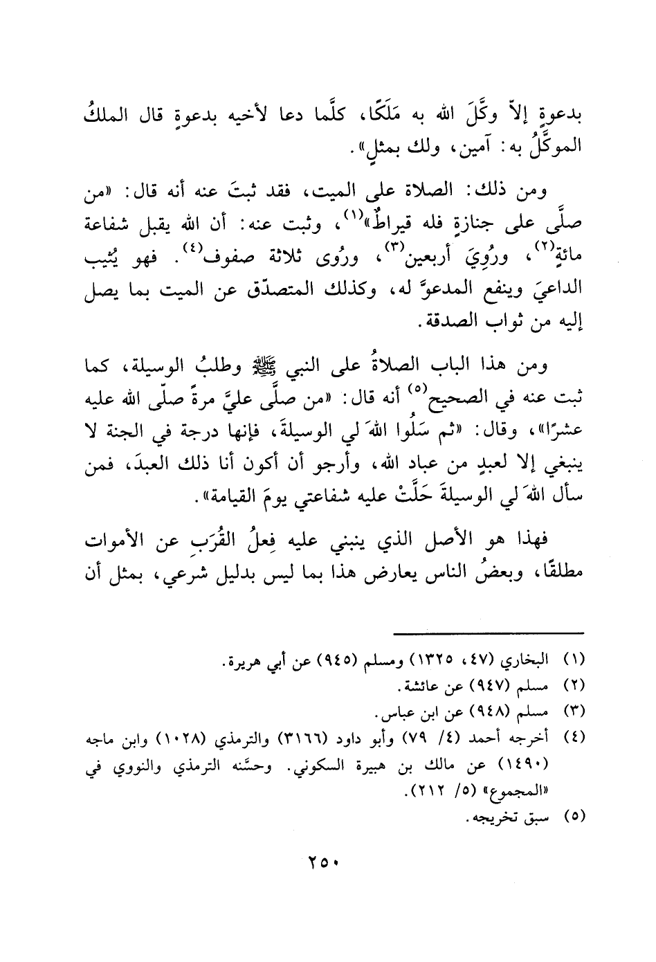 ومن هذا الباب الصلاةُ على النبي - صَلَّى اللَّهُ عَلَيْهِ وَسَلَّمَ - وطلبُ الوسيلة، كما ثبت عنه في الصحيح (5) أنه قال: "من صلى عليَّ مرةً صلى الله عليه عشرًا"، وقال: "ثم سَلُوا الله لي الوسيلةَ، فإنها درجة في الجنة لا ينبغي إلاّ لعبد من عباد الله، وأرجو أن أكون أنا ذلك العبدَ، فمن سأل اللهَ لي الوسيلةَ حَفَتْ عليه شفاعتي يومَ القيامة".