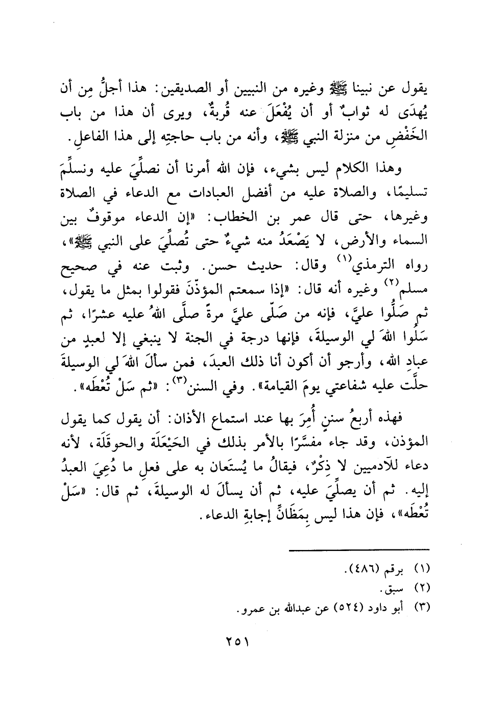 وهذا الكلام ليس بشيء، فإن الله أمرنا أن نصلِّيَ عليه ونسلِّمَ تسليمًا، والصلاة عليه من أفضل العبادات مع الدعاء في الصلاة وغيرها، حتى قال عمر بن الخطاب: "إن الدعاء موقوفٌ بين السماء والأرض، لا يَصْعَدُ منه شيءٌ حتى تُصلِّيَ على النبي - صَلَّى اللَّهُ عَلَيْهِ وَسَلَّمَ - "، رواه الترمذي (1) وقال: حديث حسن. وثبت عنه في صحيح مسلم (2) وغيره أنه قال: "إذا سمعتم المؤذّنَ فقولوا بمثل ما يقول، ثم صَلُّوا على، فإنه من صَلّى عليَّ مرةً صلَّى الله عليه عشرًا، ثم سلُوا الله لي الوسيلةَ، فإنها درجة في الجنة لا ينبغي إلاّ لعبدٍ من عبادِ الله، وأرجو أن أكون أنا ذلك العبدَ، فمن سألَ الله لي الوسيلةَ حلَّت عليه شفاعتي يومَ القيامة". وفي السنن (3): "ثم سَلْ تُعْطَه ".