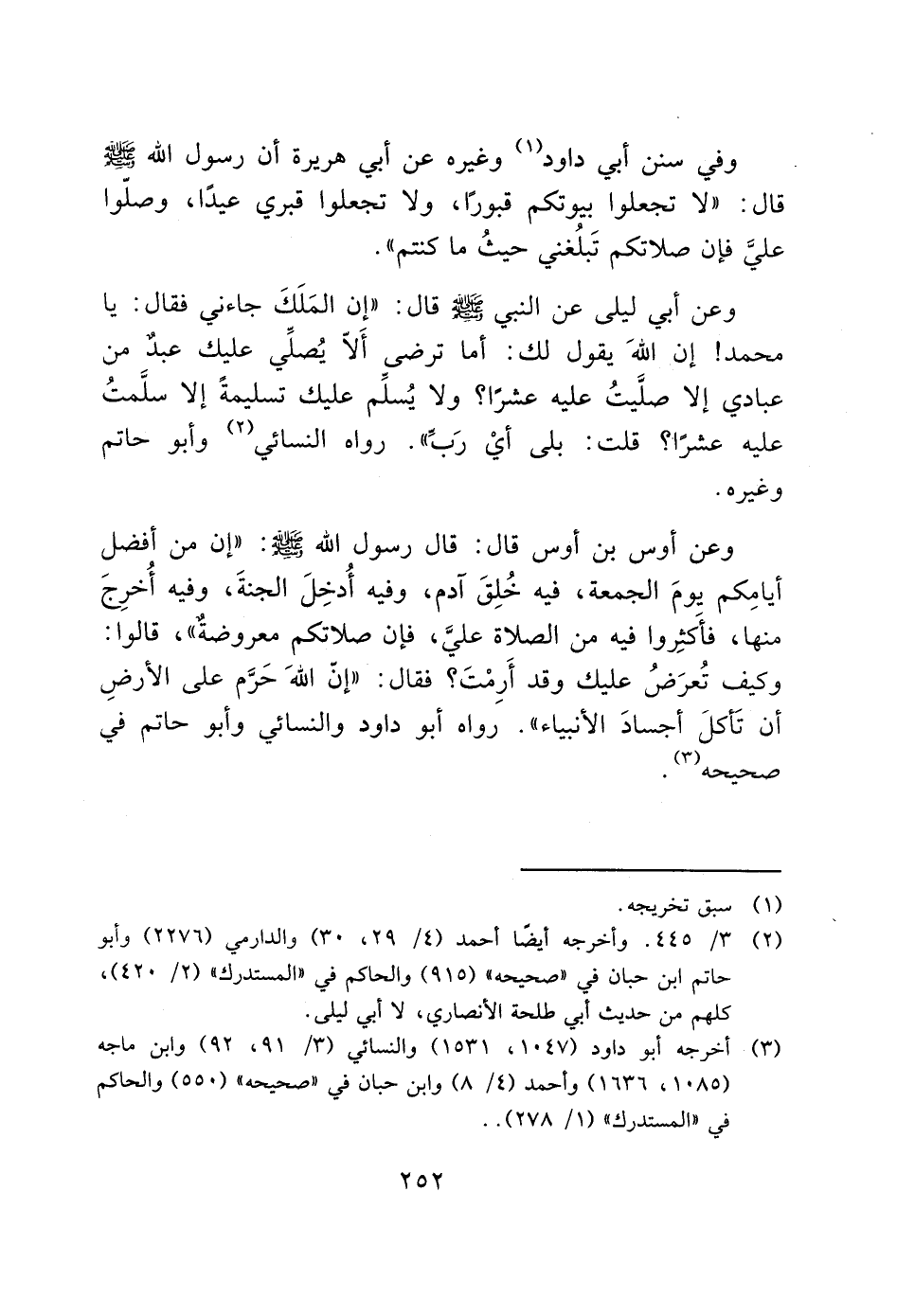 وعن أوس بن أوس قال: قال رسول الله - صَلَّى اللَّهُ عَلَيْهِ وَسَلَّمَ -: "إن من أفضل أيامِكم يومَ الجمعة، فيه خُلِقَ آدم، وفيه أُدخِلَ الجنةَ، وفيه أُخرِجَ منها، فأَكثِروا فيه من الصلاة عليَّ، فإن صلاتكم معروضة"، قالوا: وكيف تُعرَضُ عليك وقد أَرِمْتَ؟ فقال: "إنّ الله حَرَّم على الأرضِ أن تَأكلَ أجسادَ الأنبياء". رواه أبو داود والنسائي وأبو حاتم في صحيحه (3).