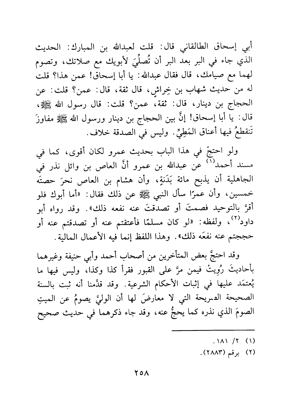 أبي إسحاق الطالقاني قال: قلت لعبد الله بن المبارك: الحديث الذي جاء في البر بعد البر أن تُصلِّيَ لأبويك مع صلاتك، وتصوم لهما مع صيامك، قال فقال عبد الله: يا أبا إسحاق! عمن هذا؟ قلت له من حديث شهاب بن خِراشٍ، قال ثقة، قال: عمن؟ قلت: عن الحجاج بن دينار، قال: ثقة، عمن؟ قلت: قال رسول الله - صَلَّى اللَّهُ عَلَيْهِ وَسَلَّمَ -، قال: يا أبا إسحاق! إنَّ بين الحجاج بن دينار ورسول الله - صَلَّى اللَّهُ عَلَيْهِ وَسَلَّمَ - مفاوزَ تَنقطعُ فيها أعناق المَطِيِّ. وليس في الصدقة خلاف.
