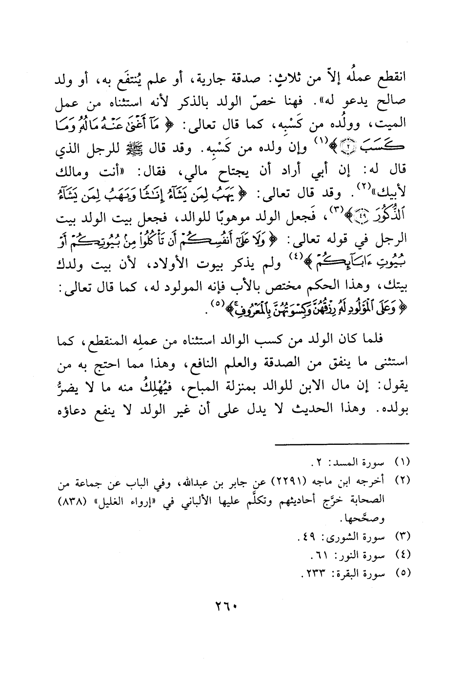 انقطع عملُه إلاّ من ثلاثٍ: صدقة جارية، أو علم يُنتفَع به، أو ولد صالح يدعو له". فهنا خصّ الولد بالذكر لأنه استثناه من عمل الميت، وولُده من كَسْبِه، كما قال تعالى: (مَا أَغْنَى عَنْهُ مَالُهُ وَمَا كَسَبَ (2)) (1) وإن ولده من كَسْبه. وقد قال - صَلَّى اللَّهُ عَلَيْهِ وَسَلَّمَ - للرجل الذي قال له: إن أبي أراد أن يجتاحَ مالي، فقال: "أنت ومالك لأبيك" (2). وقد قال تعالى: (يَهَبُ لِمَنْ يَشَاءُ إِنَاثاً وَيَهَبُ لِمَنْ يَشَاءُ الذُّكُورَ (49)) (3)، فَجعل الولد موهوباً للوالد، فجعل بيت الولد بيت الرجل في قوله تعالى: (وَلا عَلَى أَنْفُسِكُمْ أَنْ تَأْكُلُوا مِنْ بُيُوتِكُمْ أَوْ بُيُوتِ آبَائِكُمْ) (4) ولم يذكر بيوت الأولاد، لأن بيت ولدك بيتك، وهذا الحكم مختص بالأب فإنه المولود له، كما قال تعالى: (وَعَلَى الْمَوْلُودِ لَهُ رِزْقُهُنَّ وَكِسْوَتُهُنَّ بِالْمَعْرُوفِ) (5).