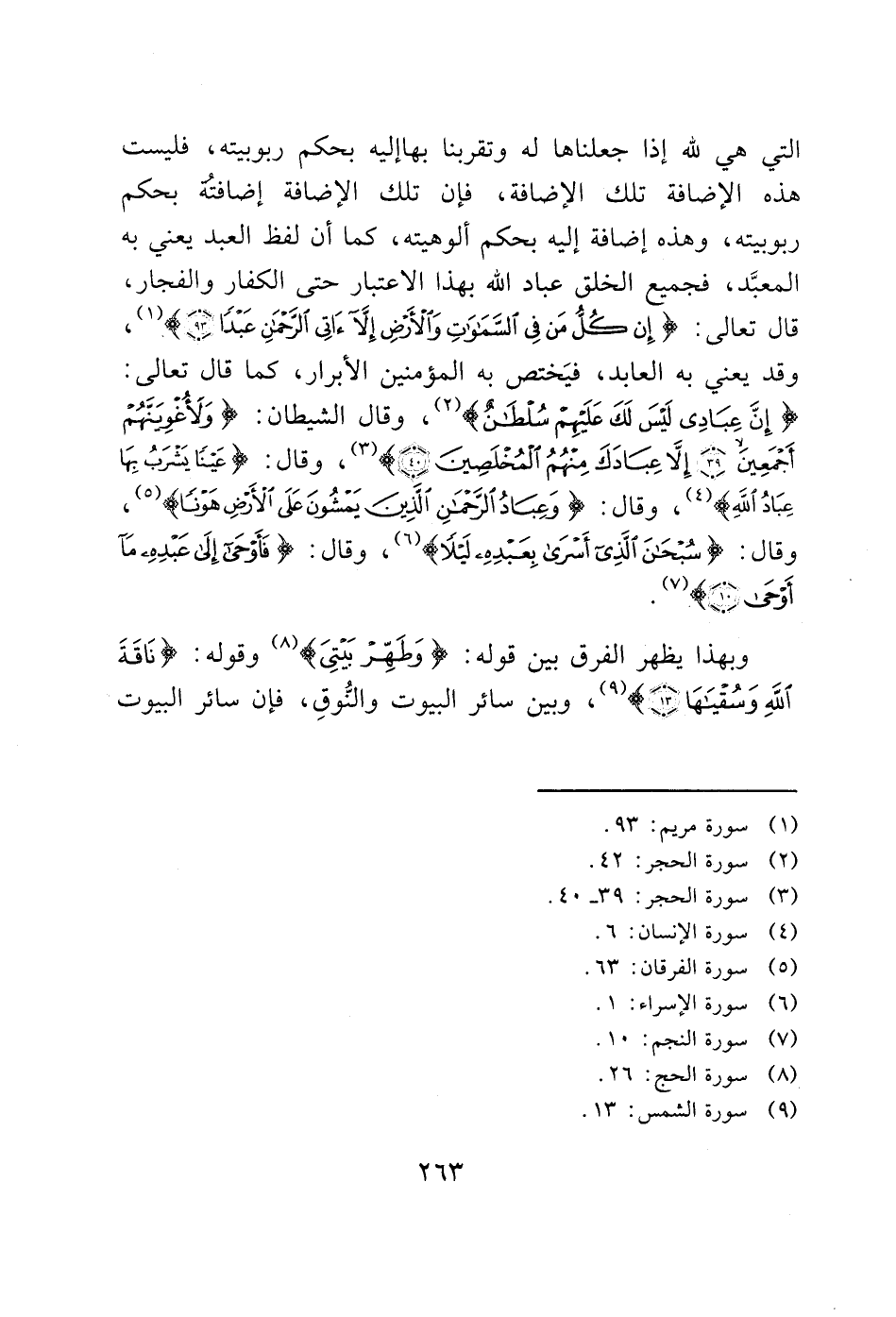 التي هي لله إذا جعلناها له وتقربنا بها إليه بحكم ربوبيته، فليست هذه الإضافة تلك الإضافة، فإن تلك الإضافة إضافتهٌ بحكم ربوبيته، وهذه إضافة إليه بحكم ألوهيته، كما أن لفظ العبد يعني به المعبَّد، فجميع الخلق عباد الله بهذا الاعتبار حتى الكفار والفجار، قال تعالى: (إِنْ كُلُّ مَنْ فِي السَّمَاوَاتِ وَالْأَرْضِ إِلَّا آتِي الرَّحْمَنِ عَبْداً (93)) (1)، وقد يعني به العابد، فيَختص به المؤمنين الأبرار، كما قال تعالى: (إِنَّ عِبَادِي لَيْسَ لَكَ عَلَيْهِمْ سُلْطَانٌ) (2)، وقال الشيطان: (وَلَأُغْوِيَنَهُم أَجمعِينَ (39) إِلَّا عبادَكَ مِنهُمُ اَلمُخلَصِينَ (40)) (3)، وقال: (عَيْناً يَشْرَبُ بِهَا عِبَادُ اللَّهِ) (4)، وقال: (وَعِبَادُ الرَّحْمَنِ الَّذِينَ يَمْشُونَ عَلَى الْأَرْضِ هَوْناً) (5)، وقال: (سُبْحَانَ الَّذِي أَسْرَى بِعَبْدِهِ لَيْلاً) (6)، وقال: (فَأَوْحَى إِلَى عَبْدِهِ مَا أَوْحَى (10)) (7).
