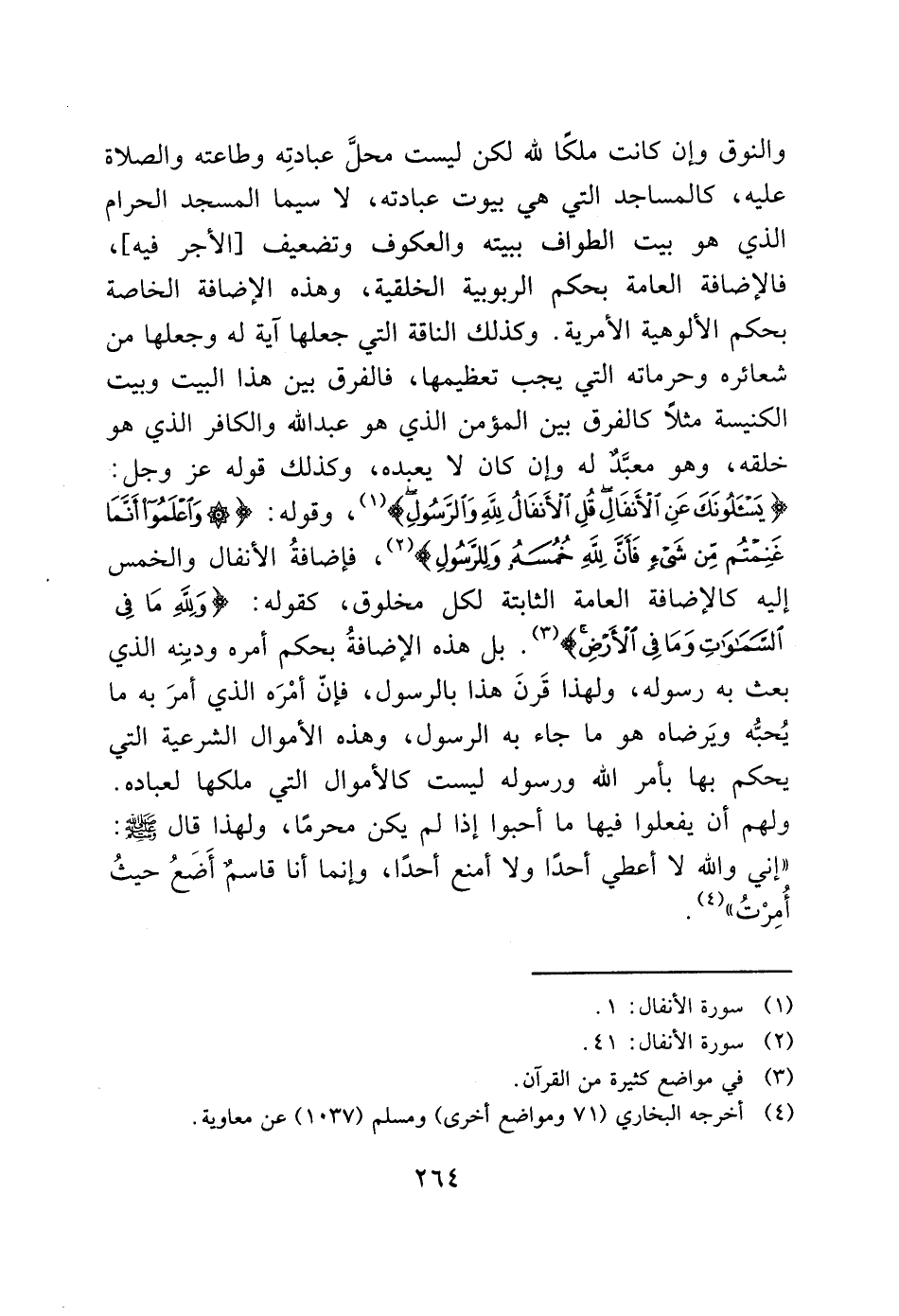والنوق وإن كانت ملكًا لله لكن ليست محلَّ عبادتِه وطاعته والصلاة عليه، كالمساجد التي هي بيوت عبادته، لا سيما المسجد الحرام الذي هو بيت الطواف ببيته والعكوف وتضعيف [الأجر فيه]، فالإضافة العامة بحكم الربوبية الخلقية، وهذه الإضافة الخاصة بحكم الألوهية الأمرية. وكذلك الناقة التي جعلها آية له وجعلها من شعائره وحرماته التي يجب تعظيمها، فالفرق بين هذا البيت وبيت الكنيسة مثلاً كالفرق بين المؤمن الذي هو عبد الله والكافر الذي هو خلقه، وهو معبَّدٌ له وإن كان لا يعبده، وكذلك قوله عز وجل: (يَسْأَلونَكَ عَنِ الْأَنْفَالِ قُلِ الْأَنْفَالُ لِلَّهِ وَالرَّسُولِ) (1)، وقوله: (وَاعْلَمُوا أَنَّمَا غَنِمْتُمْ مِنْ شَيْءٍ فَأَنَّ لِلَّهِ خُمُسَهُ وَلِلرَّسُولِ) (2)، فإضافةُ الأنفال والخمس إليه كالإضافة العامة الثابتة لكل مخلوق، كقوله: (وَلِلَّهِ مَا فِي السَّمَاوَاتِ وَمَا فِي الْأَرْضِ) (3). بل هذه الإضافةُ بحكم أمره ودينِه الذي بعث به رسوله، ولهذا قَرنَ هذا بالرسول، فإنّ أمْرَه الذي أمرَ به ما يُحبُّه ويَرضاه هو ما جاء به الرسول، وهذه الأموال الشرعية التي يحكم بها بأمر الله ورسوله ليست كالأموال التي ملكها لعباده.