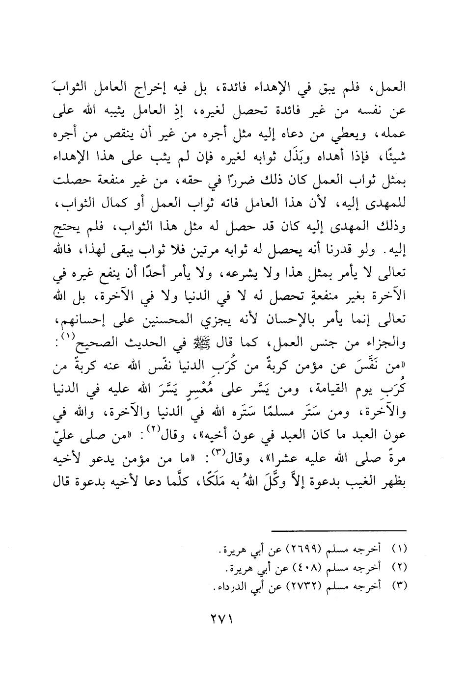 العمل، فلم يبق في الإهداء فائدة، بل فيه إخراج العامل الثوابَ عن نفسه من غير فائدة تحصل لغيره، إذِ العامل يثيبه الله على عمله، ويعطي من دعاه إليه مثل أجره من غير أن ينقص من أجره شيئًا، فإذا أهداه وبَذَل ثوابه لغيره فإن لم يثب على هذا الإهداء بمثل ثواب العمل كان ذلك ضررًا في حقه، من غير منفعة حصلت للمهدى إليه، لأن هذا العامل فاته ثواب العمل أو كمال الثواب، وذلك المهدى إليه كان قد حصل له مثل هذا الثواب، فلم يحتج إليه. ولو قدرنا أنه يحصل له ثوابه مرتين فلا ثواب يبقى لهذا، فالله تعالى لا يأمر بمثل هذا ولا يشرعه، ولا يأمر أحدًا أن ينفع غيره في الآخرة بغير منفعةٍ تحصل له لا في الدنيا ولا في الآخرة، بل الله تعالى إنما يأمر بالإحسان لأنه يجزي المحسنين على إحسانهم، والجزاء من جنس العمل، كما قال - صَلَّى اللَّهُ عَلَيْهِ وَسَلَّمَ - في الحديث الصحيح (1): "من نَفَّسَ عن مؤمن كربة من كُرَبِ الدنيا نفّس الله عنه كربةً من كُرَبِ يوم القيامة، ومن يَسَّر على مُعْسِرٍ يَسَّرَ الله عليه في الدنيا والآخرة، ومن سَتَر مسلمًا سَتَره الله في الدنيا والآخرة، والله في عون العبد ما كان العبد في عون أخيه"، وقال (2): "من صلى عليّ مرةً صلى الله عليه عشرا"، وقال (3): "ما من مؤمن يدعو لأخيه بظهر الغيب بدعوة إلاّ وكَّلَ الله به مَلَكًا، كلَّما دعا لأخيه بدعوة قال