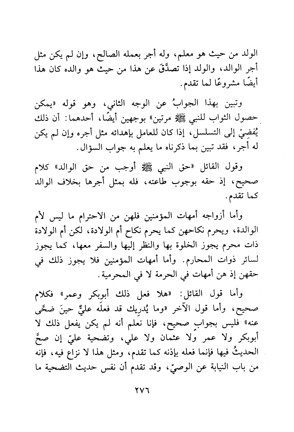 وتبين بهذا الجوابُ عن الوجه الثاني، وهو قوله "يمكن حصول الثواب للنبي - صَلَّى اللَّهُ عَلَيْهِ وَسَلَّمَ - مرتين" بوجهين أيضًا، أحدهما: أن ذلك يُفضِيْ إلى التسلسل، إذا كان للعامل بإهدائه مثل أجره وإن لم يكن له أجر، فقد تبين بما ذكرناه ما يعلم به جواب السؤال.