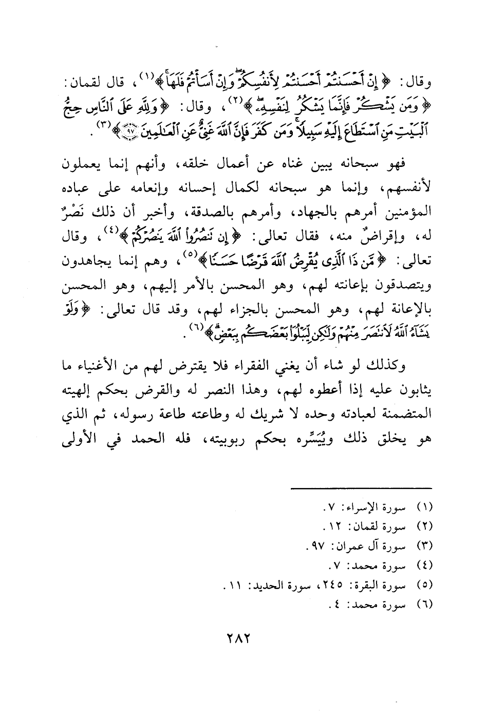 فهو سبحانه يبين غناه عن أعمال خلقه، وأنهم إنما يعملون لأنفسهم، وإنما هو سبحانه لكمال إحسانه وإنعامه على عباده المؤمنين أمرهم بالجهاد، وأمرهم بالصدقة، وأخبر أن ذلك نَصْرٌ له، وإقراضٌ منه، فقال تعالى: (إِنْ تَنْصُرُوا اللَّهَ يَنْصُرْكُمْ) (4)، وقال تعالى: (مَنْ ذَا الَّذِي يُقْرِضُ اللَّهَ قَرْضاً حَسَناً) (5)، وهم إنما يجاهدون ويتصدقون بإعانته لهم، وهو المحسن بالأمر إليهم، وهو المحسن بالإعانة لهم، وهو المحسن بالجزاء لهم، وقد قال تعالى (وَلَوْ يَشَاءُ اللَّهُ لانْتَصَرَ مِنْهُمْ وَلَكِنْ لِيَبْلُوَ بَعْضَكُمْ بِبَعْضٍ) (6).
