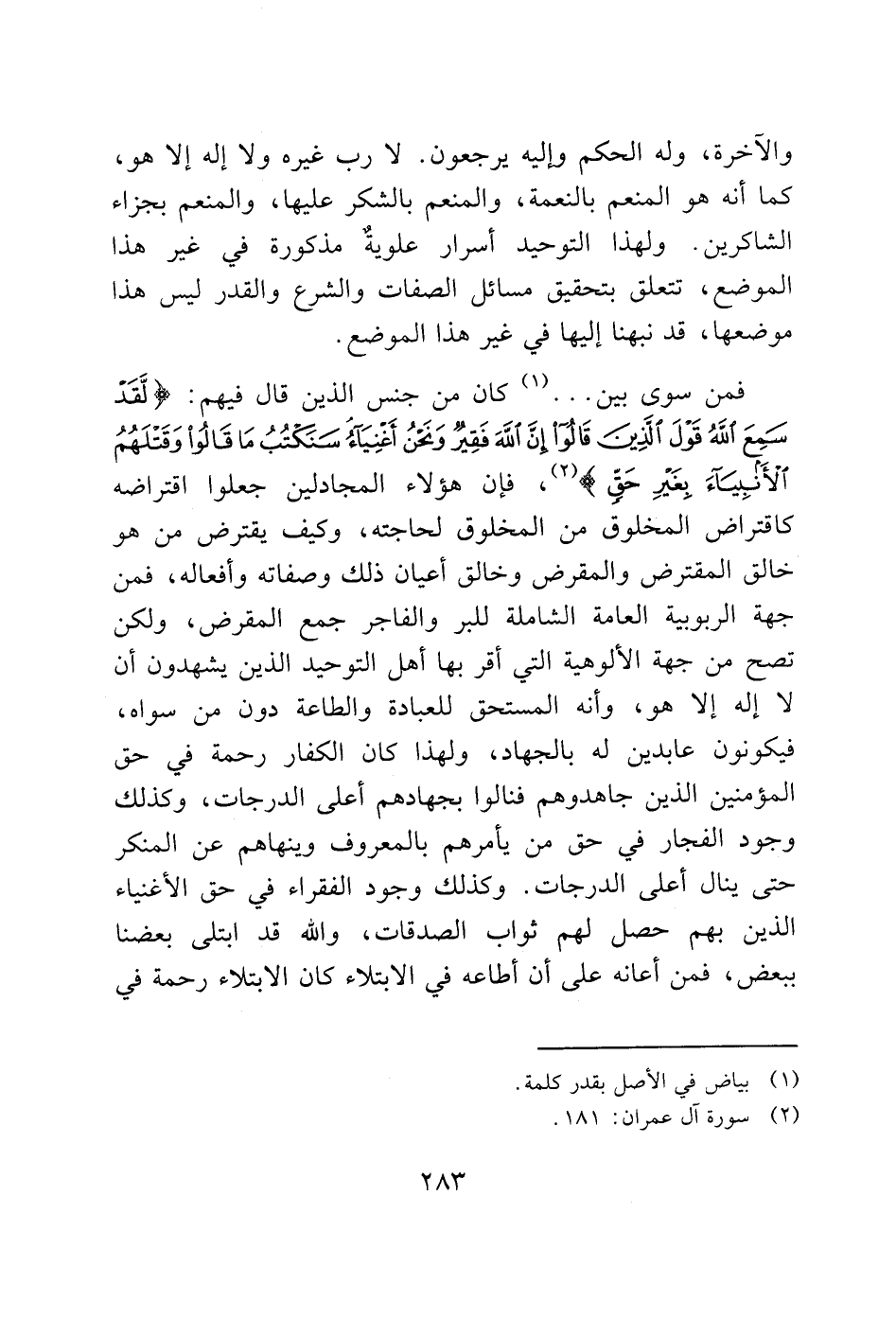 فمن سوى بين ... (1) كان من جنس الذين قال فيهم (لَقَدْ سَمِعَ اللَّهُ قَوْلَ الَّذِينَ قَالُوا إِنَّ اللَّهَ فَقِيرٌ وَنَحْنُ أَغْنِيَاءُ سَنَكْتُبُ مَا قَالُوا وَقَتْلَهُمُ الْأَنْبِيَاءَ بِغَيْرِ حَقٍّ) (2)، فإن هؤلاء المجادلين جعلوا اقتراضه كاقتراض المخلوق من المخلوق لحاجته، وكيف يقترض من هو خالق المقترض والمقرض وخالق أعيان ذلك وصفاته وأفعاله، فمن جهة الربوبية العامة الشاملة للبر والفاجر جمع المقرض، ولكن تصح من جهة الألوهية التي أقر بها أهل التوحيد الذين يشهدون أن لا إله إلا هو، وأنه المستحق للعبادة والطاعة دون من سواه، فيكونون عابدين له بالجهاد، ولهذا كان الكفار رحمة في حق المؤمنين الذين جاهدوهم فنالوا بجهادهم أعلى الدرجات، وكذلك وجود الفجار في حق من يأمرهم بالمعروف وينهاهم عن المنكر حتى ينال أعلى الدرجات. وكذلك وجود الفقراء في حق الأغنياء الذين بهم حصل لهم ثواب الصدقات، والله قد ابتلى بعضنا ببعض، فمن أعانه على أن أطاعه في الابتلاء كان الابتلاء رحمة في