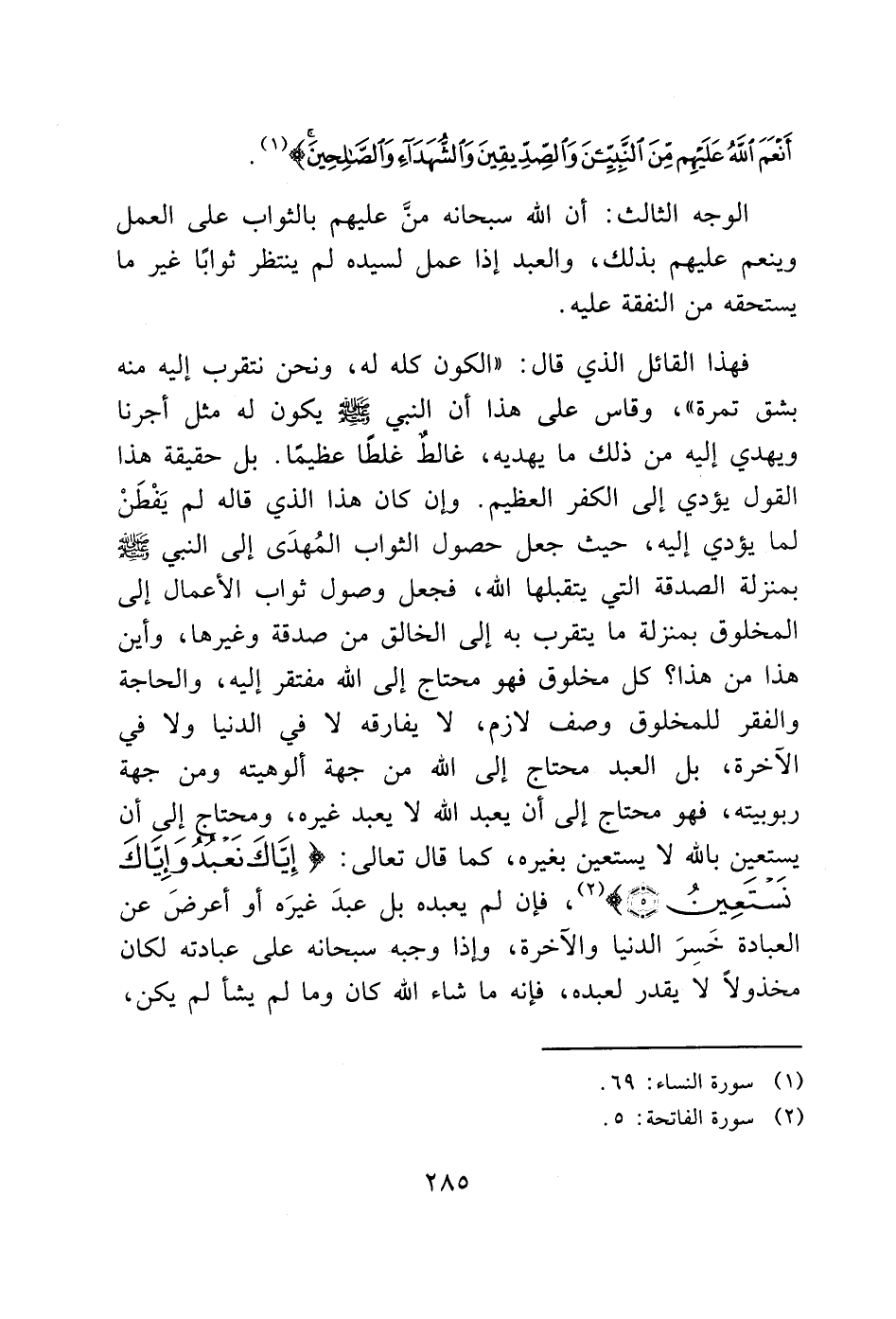 فهذا القائل الذي قال: "الكون كله له، ونحن نتقرب إليه منه بشق تمرة"، وقاس على هذا أن النبي - صَلَّى اللَّهُ عَلَيْهِ وَسَلَّمَ - يكون له مثل أجرنا ويهدي إليه من ذلك ما يهديه، غالطٌ غلطًا عظيمًا. بل حقيقة هذا القول يؤدي إلى الكفر العظيم. وإن كان هذا الذي قاله لم يَفْطَنْ لما يؤدي إليه، حيث جعل حصول الثواب المُهدَى إلى النبي - صَلَّى اللَّهُ عَلَيْهِ وَسَلَّمَ - بمنزلة الصدقة التي يتقبلها الله، فجعل وصول ثواب الأعمال إلى المخلوق بمنزلة ما يتقرب به إلى الخالق من صدقة وغيرها، وأين هذا من هذا؟ كل مخلوق فهو محتاج إلى الله مفتقر إليه، والحاجة والفقر للمخلوق وصف لازم، لا يفارقه لا في الدنيا ولا في الآخرة، بل العبد محتاج إلى الله من جهة ألوهيته ومن جهة ربوبيته، فهو محتاج إلى أن يعبد الله لا يعبد غيره، ومحتاج إلى أن يستعيِن بالله لا يستعين بغيره، كما قال تعالى: (إِيَّاكَ نَعْبدُ وَإِيَّاكَ نَسْتَعِينُ (5)) (2)، فإن لم يعبده بل عبدَ غيرَه أو أعرضَ عن العبادة خَسِرَ الدنيا والآخرة، وإذا وجبه سبحانه على عبادته لكان مخذولاً لا يقدر لعبده، فإنه ما شاء الله كان وما لم يشأ لم يكن،