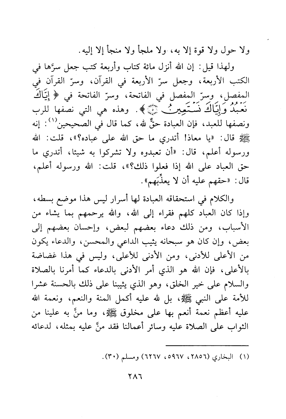 ولهذا قيل: إن الله أنزل مائة كتاب وأربعة كتب جعل سرَّها في الكتب الأربعة، وجعل سرّ الأربعة في القرآن، وسرّ القرآن في المغصل، وسرِّ المفصل في الفاتحة، وسرّ الفاتحة في (إِيَّاكَ نَعْبدُ وَإِيَّاكَ نَسْتَعِينُ). وهذه هي التي نصفها للرب ونصفها للعبد، فإن العبادة حقّ لله، كما قال في الصحيحين (1): إنه - صَلَّى اللَّهُ عَلَيْهِ وَسَلَّمَ - قال: "يا معاذ! أتدري ما حق الله على عباده؟ "، قلت: الله ورسوله أعلم، قال: "أن تعبدوه ولا تشركوا به شيئا، أتدري ما حق العباد على الله إذا فعلوا ذلك؟ "، قلت: الله ورسوله أعلم، قال: "حقهم عليه أن لا يعذِّبَهم".