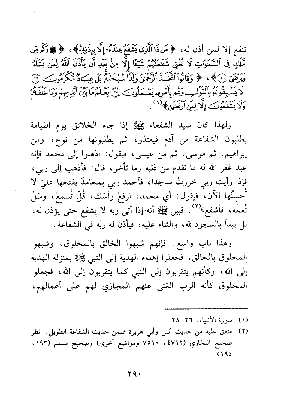 ولهذا كان سيد الشفعاء - صَلَّى اللَّهُ عَلَيْهِ وَسَلَّمَ - إذا جاء الخلائق يوم القيامة يطلبون الشفاعة من آدم فيعتذر، ثم يطلبونها من نوح، ومن إبراهيم، ثم موسى، ثم من عيسى، فيقول: اذهبوا إلى محمد فإنه عبد غفر الله له ما تقدم من ذنبه وما تأخر، قال: فأذهب إلى ربي، فإذا رأيت ربي خررتُ ساجدا، فأحمد ربي بمحامدَ يفتحها عليّ لا أُحسِنُها الآن، فيقول: أي محمد، ارفعْ رأسَك، قُلْ تُسمعْ، وسَلْ تُعطَه، فأشفع" (2). فبين - صَلَّى اللَّهُ عَلَيْهِ وَسَلَّمَ - أنه. إذا أتى ربه لا يشفع حتى يؤذن له، بل يبدأ بالسجود لله، والثناء عليه، فيأذن له ربه في الشفاعة.