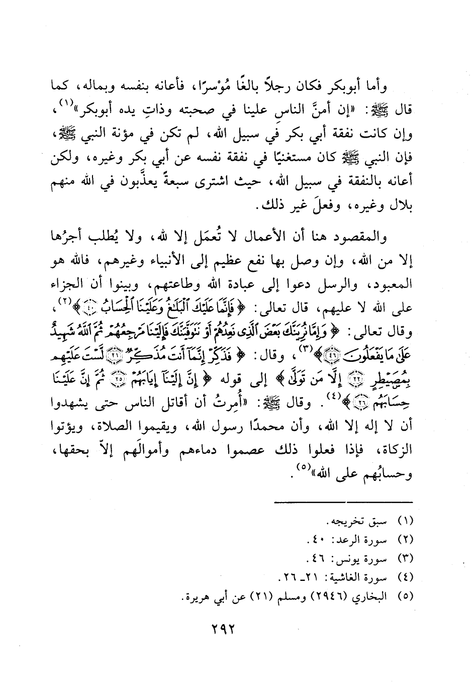 وأما أبو بكر فكان رجلاً بالغًا مُوْسرًا، فأعانه بنفسه وبماله، كما قال - صَلَّى اللَّهُ عَلَيْهِ وَسَلَّمَ -: "إن أمنَّ الناسِ علينا في صحبته وذاتِ يده أبو بكر" (1)، وإن كانت نفقة أبي بكر في سبيل الله، لم تكن في مؤنة النبي - صَلَّى اللَّهُ عَلَيْهِ وَسَلَّمَ -، فإن النبي - صَلَّى اللَّهُ عَلَيْهِ وَسَلَّمَ - كان مستغنيًا في نفقة نفسه عن أبي بكر وغيره، ولكن أعانه بالنفقة في سبيل الله، حيث اشترى سبعةً يعذَّبون في الله منهم بلال وغيره، وفعلَ غير ذلك.