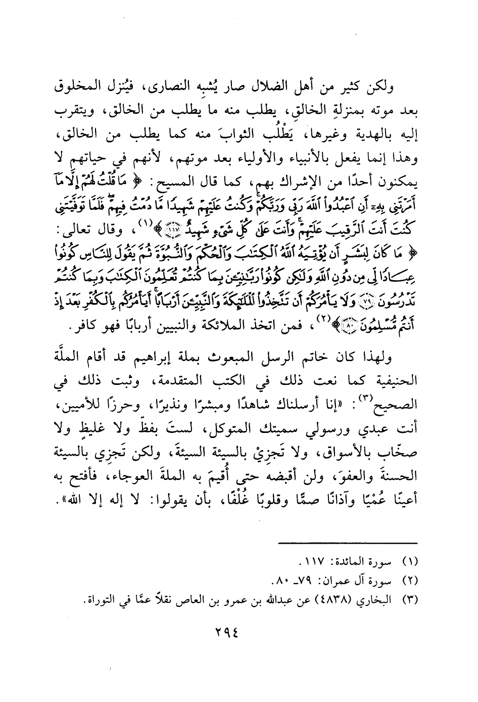 ولكن كثير من أهل الضلال صار يُشبه النصارى، فيُنزل المخلوق بعد موته بمنزلةِ الخالقِ، يطلب منه ماَ يطلب من الخالق، ويتقرب إليه بالهدية وغيرها، يَطْلُب الثوابَ منه كما يطلب من الخالق، وهذا إنما يفعل بالأنبياء والأولياء بعد موتهم، لأنهم في حياتهمِ لا يمكنون أحدًا من الإشراك بهم، كما قال المسيح: (مَا قُلْتُ لَهُمْ إِلَّا مَا أَمَرْتَنِي بِهِ أَنِ اعْبُدُوا اللَّهَ رَبِّي وَرَبَّكُمْ وَكُنْتُ عَلَيْهِمْ شَهِيداً مَا دُمْتُ فِيهِمْ فَلَمَّا تَوَفَّيْتَنِي كُنْتَ أَنْتَ الرَّقِيبَ عَلَيْهِمْ وَأَنْتَ عَلَى كُلِّ شَيْءٍ شَهِيدٌ (117)) (1)، وقال تعالى: (مَا كَانَ لِبَشَرٍ أَنْ يُؤْتِيَهُ اللَّهُ الْكِتَابَ وَالْحُكْمَ وَالنُّبُوَّةَ ثُمَّ يَقُولَ لِلنَّاسِ كُونُوا عِبَاداً لِي مِنْ دُونِ اللَّهِ وَلَكِنْ كُونُوا رَبَّانِيِّينَ بِمَا كُنْتُمْ تُعَلِّمُونَ الْكِتَابَ وَبِمَا كُنْتُمْ تَدْرُسُونَ (79) وَلا يَأْمُرَكُمْ أَنْ تَتَّخِذُوا الْمَلائِكَةَ وَالنَّبِيِّينَ أَرْبَاباً أَيَأْمُرُكُمْ بِالْكُفْرِ بَعْدَ إِذْ أَنْتُمْ مُسْلِمُونَ (80)) (2)، فمن اتخذ الملائكة والنبيين أربابًا فهو كافر.