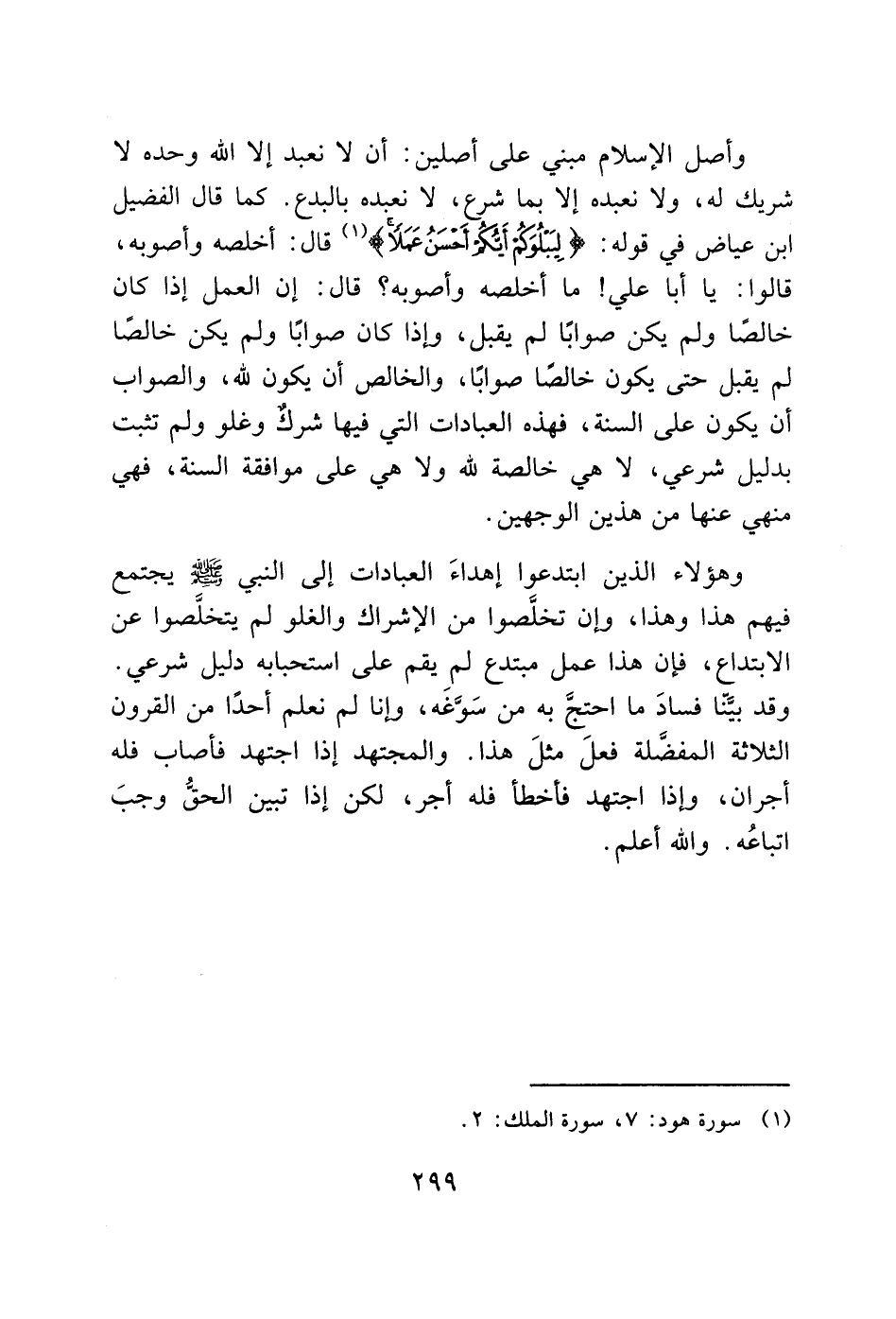 وأصل الإسلام مبني على أصلين: أن لا نعبد إلا الله وحده لا شريك له، ولا نعبده إلا بما شرع، لا نعبده بالبدع. كما قال الفضيل ابن عياض في قوله: (لِيَبْلُوَكُمْ أَيُّكُمْ أَحْسَنُ عَمَلاً) (1) قال: أخلصه وأصوبه، قالوا: يا أبا علي! ما أخلصه وأصوبه؟ قال: إن العمل إذا كان خالصًا ولم يكن صوابًا لم يقبل، وإذا كان صوابًا ولم يكن خالصًا لم يقبل حتى يكون خالصًا صوابًا، والخالص أن يكون لله، والصواب أن يكون على السنة، فهذه العبادات التي فيها شركٌ وغلو ولم تثبت بدليل شرعي، لا هي خالصة لله ولا هي على موافقة السنة، فهي منهي عنها من هذين الوجهين.