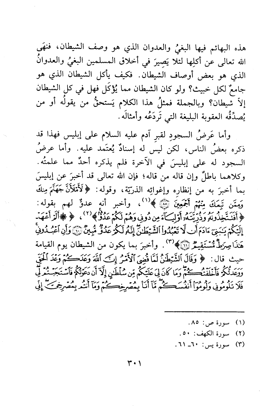 وكلاهما باطل وإن قاله من قاله؛ فإن الله تعالى قد أخبرَ عن إبليسَ بما أخبرَ به من إنظارِه وإغوائِه الذرّيّة، وقوله: (لَأَمْلَأَنَّ جَهَنَّمَ مِنْكَ وَمِمَّنْ تَبِعَكَ مِنْهُمْ أَجْمَعِينَ (85)) (1)، وأخبر أنه عدوّ لهم بقوله: (أَفَتَتَّخِذُونَهُ وَذُرِّيَّتَهُ أَوْلِيَاءَ مِنْ دُونِي وَهُمْ لَكُمْ عَدُوٌّ) (2)، (أَلَمْ أَعْهَدْ إِلَيْكُمْ يَا بَنِي آَدَمَ أَنْ لَا تَعْبُدُوا الشَّيْطَانَ إِنَّهُ لَكُمْ عَدُوٌّ مُبِينٌ (60) وَأَنِ اعْبُدُونِي هَذَا صِرَاطٌ مُسْتَقِيمٌ (61)) (3). وأخبرَ بما يكون من الشيطان يوم القيامة حيث قال: (وَقَالَ الشَّيْطَانُ لَمَّا قُضِيَ الْأَمْرُ إِنَّ اللَّهَ وَعَدَكُمْ وَعْدَ الْحَقِّ وَوَعَدْتُكُمْ فَأَخْلَفْتُكُمْ وَمَا كَانَ لِيَ عَلَيْكُمْ مِنْ سُلْطَانٍ إِلَّا أَنْ دَعَوْتُكُمْ فَاسْتَجَبْتُمْ لِي فَلا تَلُومُونِي وَلُومُوا أَنْفُسَكُمْ مَا أَنَا بِمُصْرِخِكُمْ وَمَا أَنْتُمْ بِمُصْرِخِيَّ إِنِّي