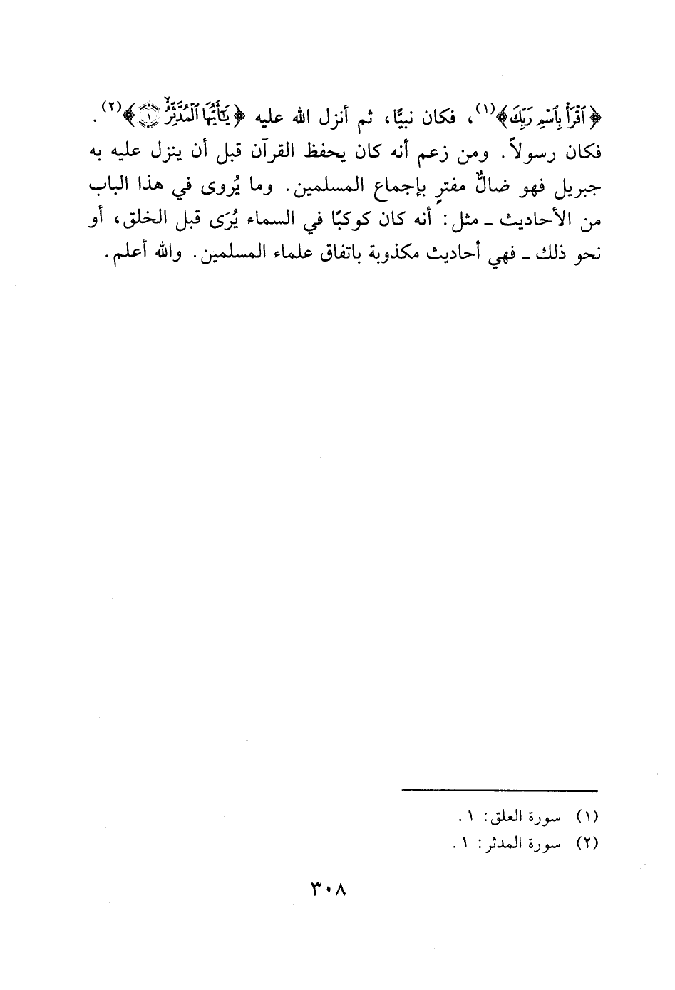 فكان رسولاً. ومن زعم أنه كان يحفظ القرآن قبل أن ينزل عليه به جبريل فهو ضالٌ مفترٍ بإجماع المسلمين. وما يُروى في هذا الباب من الأحاديث -مثل: أنه كان كوكبًا في السماء يُرَى قبل الخلق، أو نحو ذلك- فهي أحاديث مكذوبة باتفاق علماء المسلمين. والله أعلم.