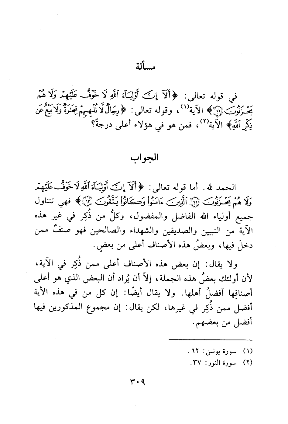 في قوله تعالى: (أَلا إِنَّ أَوْلِيَاءَ اللَّهِ لا خَوْفٌ عَلَيْهِمْ وَلا هُمْ يَحْزَنُونَ (62)) (1)، وقوله تعالى: (رِجَالٌ لا تُلْهِيهِمْ تِجَارَةٌ وَلا بَيْعٌ عَنْ ذِكْرِ اللَّهِ) الآية (2)، فمن هو في هؤلاء أعلى درجةً؟
