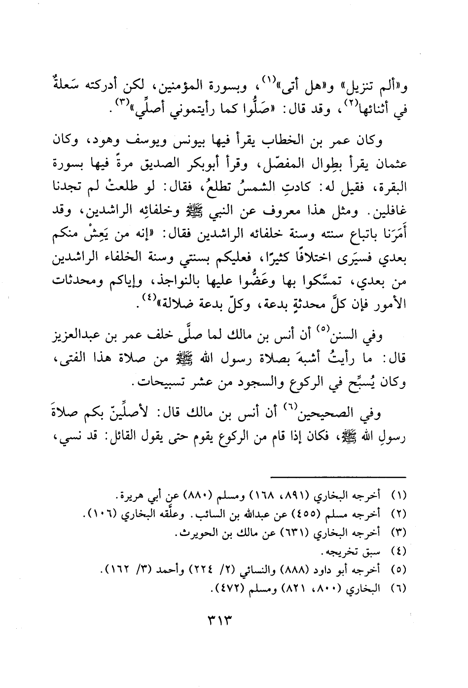 وفي السنن (5) أن أنس بن مالك لما صلّى خلف عمر بن عبد العزيز قال: ما رأيتُ أشبهَ بصلاة رسول الله - صَلَّى اللَّهُ عَلَيْهِ وَسَلَّمَ - من صلاة هذا الفتى، وكان يُسبِّح في الركوع والسجود من عشر تسبيحات.