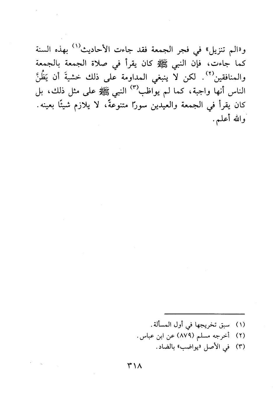 و"الم تنزيل" في فجر الجمعة فقد جاءت الأحاديث (1) بهذه السنة كما جاءت، فإن النبي - صَلَّى اللَّهُ عَلَيْهِ وَسَلَّمَ - كان يقرأ في صلاة الجمعة بالجمعة والمنافقين (2). لكن لا ينبغي المداومة على ذلك خشيةَ أن يَظُنَّ الناس أنها واجبة، كما لم يواظب (3) النبي - صَلَّى اللَّهُ عَلَيْهِ وَسَلَّمَ - على مثل ذلك، بل كان يقرأ في الجمعة والعيدين سورًا متنوعة، لا يلازم شيئًا بعينه.
