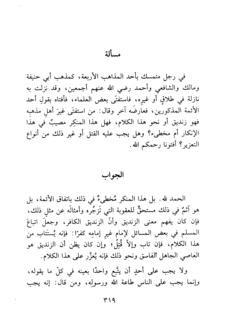 في رجل متمسك بأحد المذاهب الأربعة، كمذهب أبي حنيفة ومالك والشافعي وأحمد رضي الله عنهم أجمعين، وقد نزلت به نازلة في طلاقٍ أو غيرِه، فاستفتَى بعض العلماء، فأفتاه بقولِ أحد الأئمة المذكورين، فعارضَه آخر وقال: من استفتَى غيرَ أهلِ مذهبه فهو زنديق أو نحو هذا الكلام، فهل هذا المنكِر مصيبٌ في هذَا الإنكار أم مخطئ؟ وهل يجب عليه القتل أو غير ذلك من أنواع التعزير؟ أفتونا رحمكم الله.