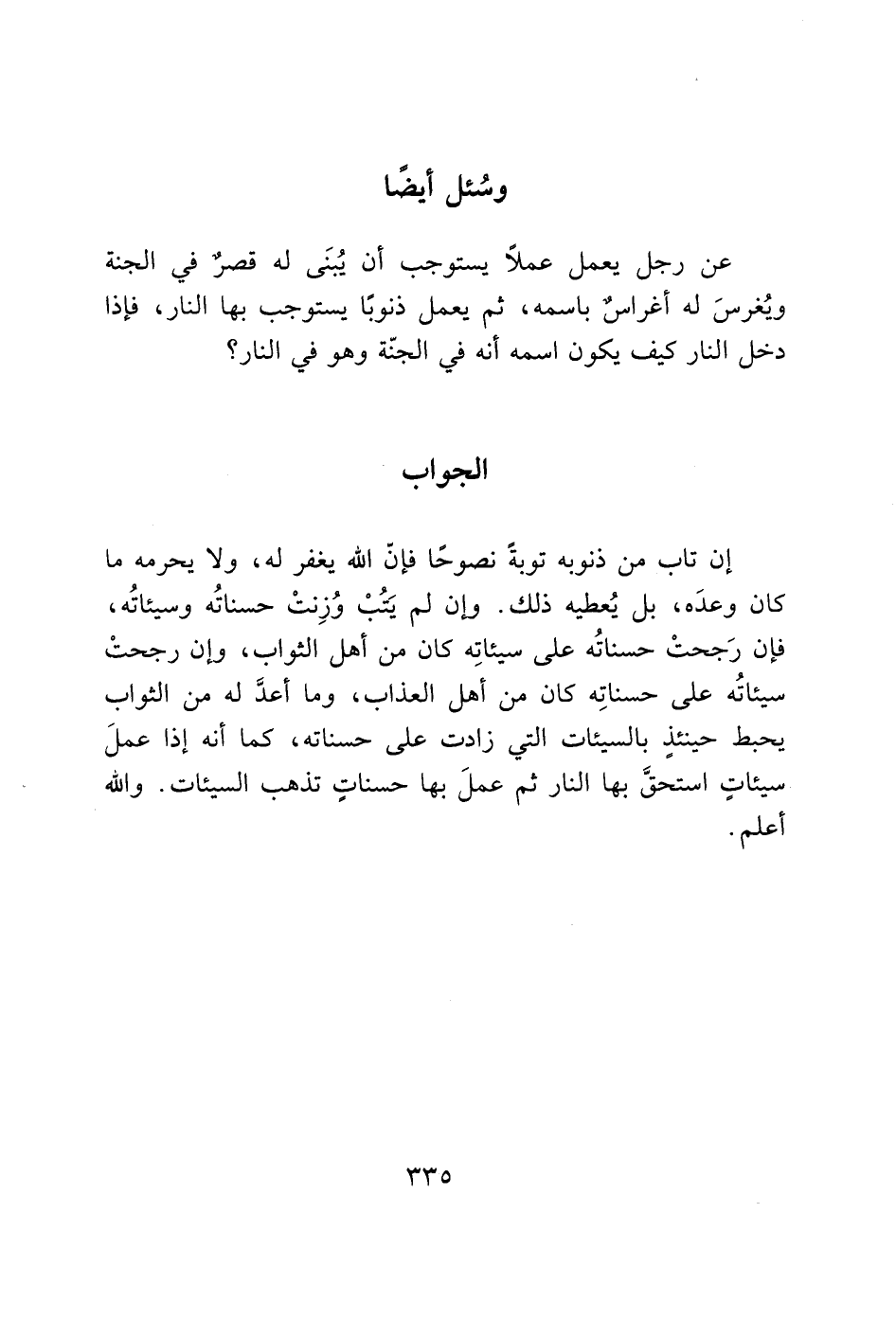 عن رجل يعمل عملاً يستوجب أن يُبنَى له قصر في الجنة ويُغرسَ له أغراس باسمه، ثم يعمل ذنوبًا يستوجب بها النار، فإذا دخل النار كيف يكون اسمه أنه في الجنّة وهو في النار؟