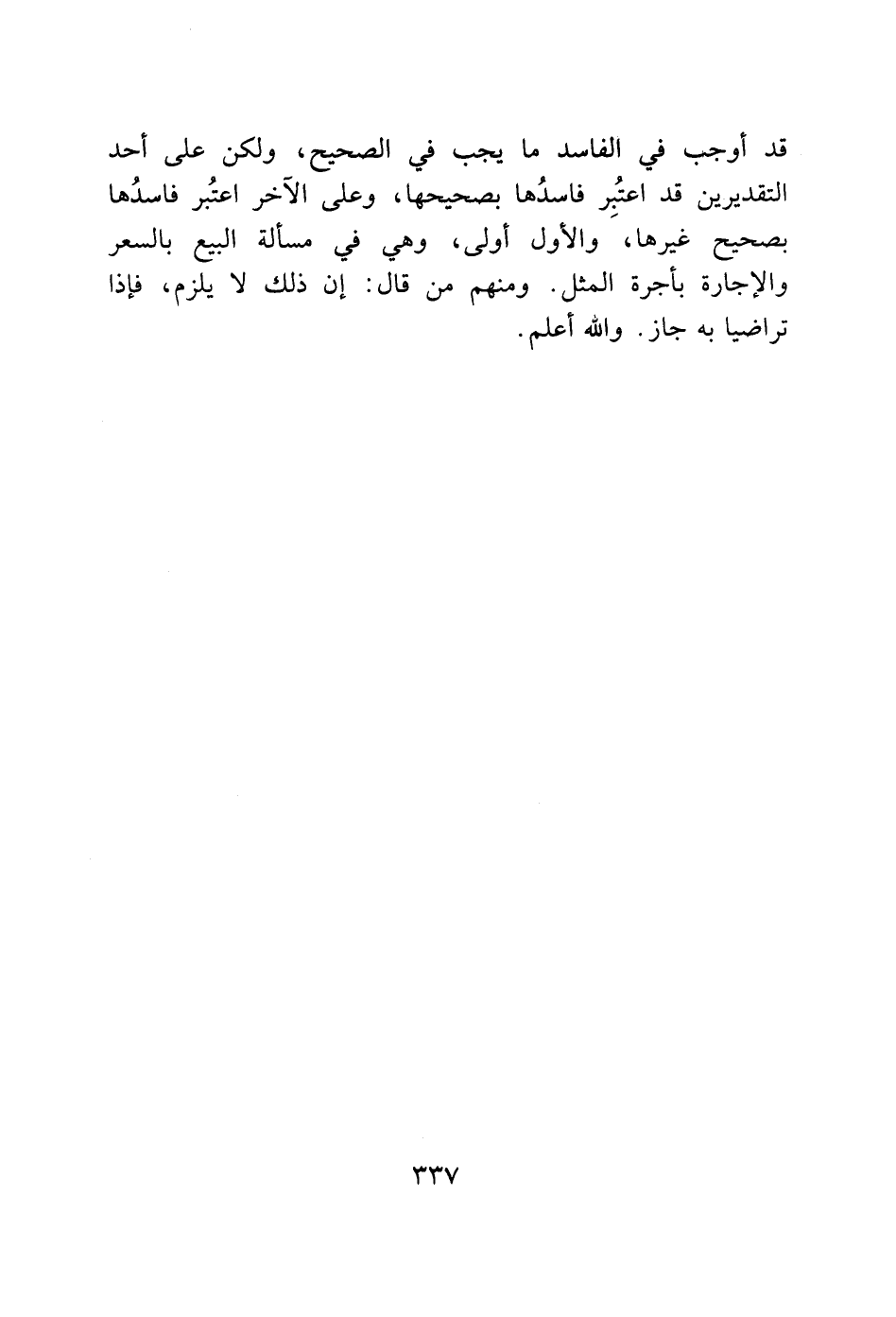 قد أوجب في الفاسد ما يجب في الصحيح، ولكن على أحد التقديرين قد اعتُبِر فاسدُها بصحيحها، وعلى الآخر اعتُبر فاسدُها بصحيح غيرها، والأول أولى، وهي في مسألة البيع بالسعر والإجارة بأجرة المثل. ومنهم من قال: إن ذلك لا يلزم، فإذا تراضيا به جاز. والله أعلم.