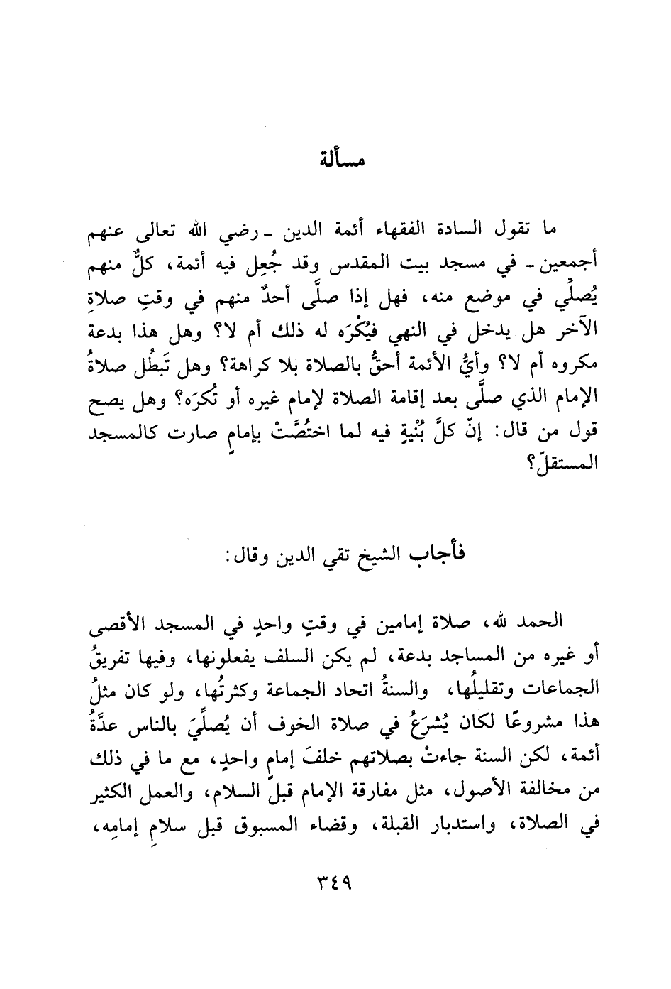 ما تقول السادة الفقهاء أئمة الدين -رضي الله تعالى عنهم أجمعين- في مسجد بيت المقدس وقد جُعِل فيه أئمة، كلّ منهم يصلّي في موضع منه، فهل إذا صلّى أحدٌ منهم في وقتِ صلاةِ الآخر هل يدخل في النهي فيُكْرَه له ذلك أم لا؟ وهل هذا بدعة مكروه أم لا؟ وأيُّ الأئمة أحق بالصلاة بلا كراهة؟ وهل تَبطُل صلاةُ الإمام الذي صلَّى بعد إقامة الصلاة لإمام غيره أو نُكرَه؟ وهل يصح قول من قال: إن كلَّ بُنْيةٍ فيه لما اختُصَّتْ بإمامٍ صارت كالمسجد المستقلّ؟