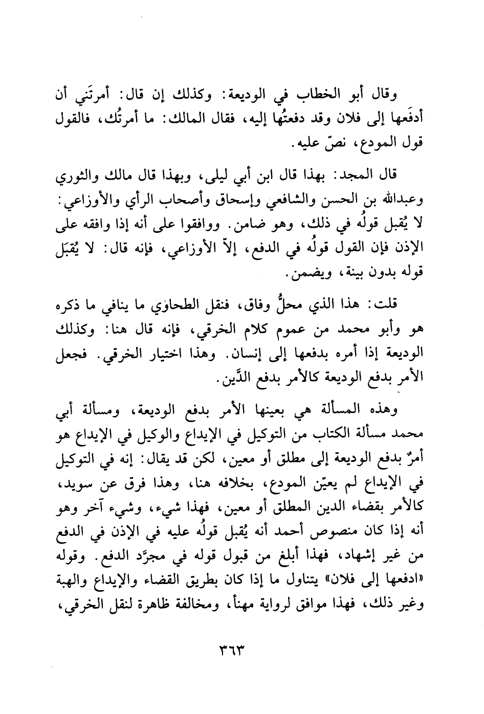 قلت: هذا الذي محلُّ وفاق، فنقل الطحاوي ما ينافي ما ذكره هو وأبو محمد من عموم كلام الخرقي، فإنه قال هنا: وكذلك الوديعة إذا أمره بدفعها إلى إنسان. وهذا اختيار الخرقي. فجعل الأمر بدفع الوديعة كالأمر بدفع الدَّين.