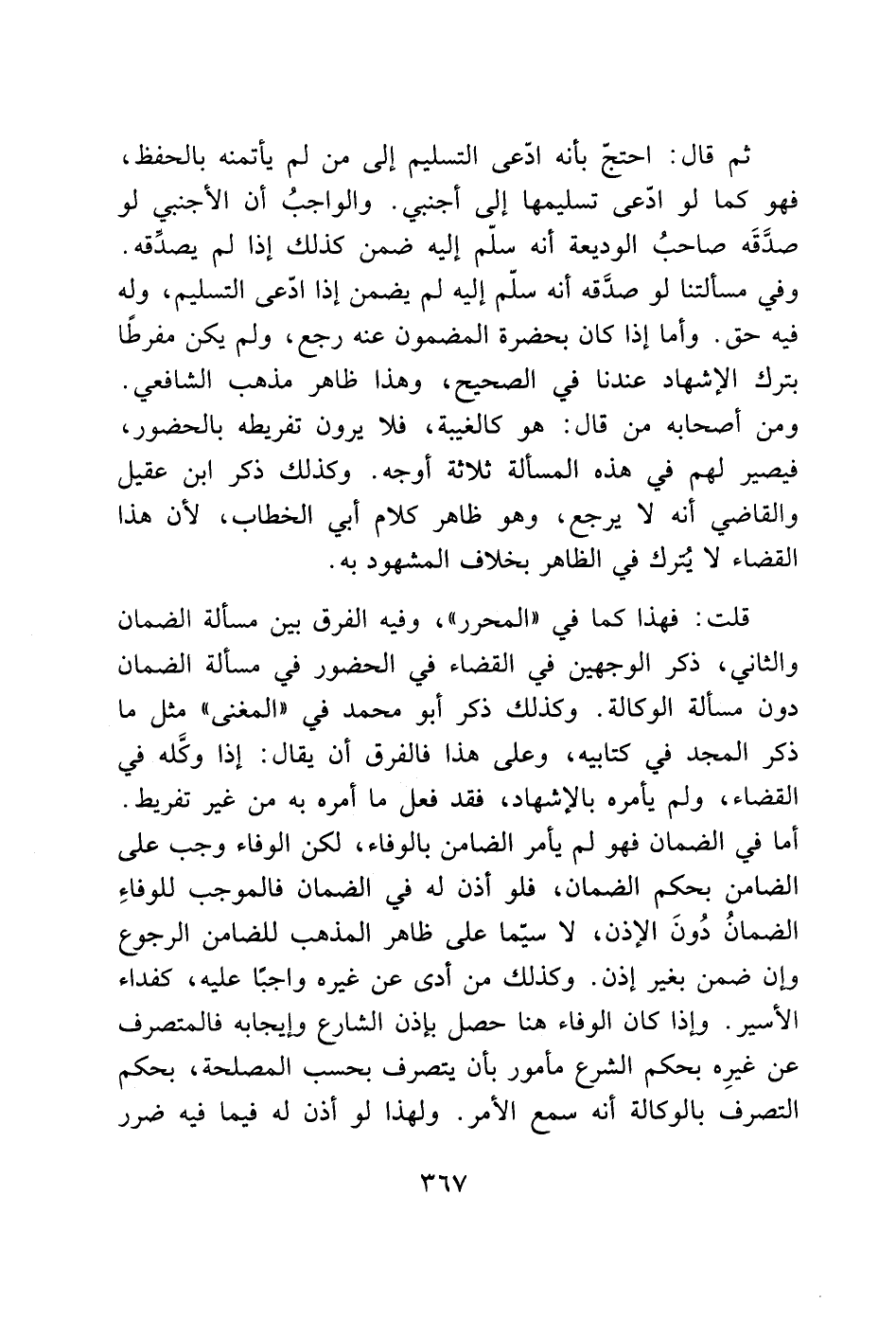 قلت: فهذا كما في "المحرر"، وفيه الفرق بين مسألة الضمان والثاني، ذكر الوجهين في القضاء في الحضور في مسألة الضمان دون مسألة الوكالة. وكذلك ذكر أبو محمد في "المغنى" مثل ما ذكر المجد في كتابيه، وعلى هذا فالفرق أن يقال: إذا وكَّله في القضاء، ولم يأمره بالإشهاد، فقد فعل ما أمره به من غير تفريط.